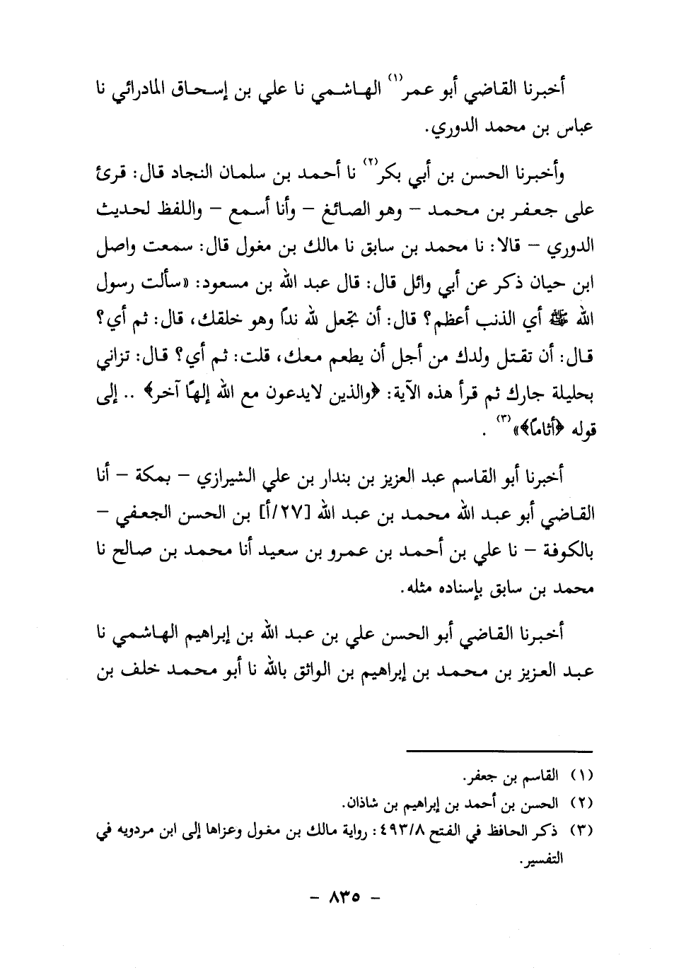 وَأَخْبَرَنَا الْحَسَنُ بْنُ أَبِي بَكْرٍ2، نا أَحْمَدُ بْنُ سَلْمَانَ النَّجَّادُ، قَالَ: قُرِئَ عَلَى جَعْفَرِ بْنِ مُحَمَّدٍ ـ وَهُوَ الصَّائِغُ ـ وَأَنا أَسْمَعُ ـ وَاللَّفْظُ لِحَدِيثِ الدُّورِيِّ ـ قَالا: نا مُحَمَّدُ بْنُ سَابِقٍ، نا مَالِكُ بْنُ مِغْوَلٍ قَالَ: سَمِعْتُ وَاصِلَ بْنَ حَيَّانَ ذَكَرَ عَنْ أَبِي وَائِلٍ قَالَ: قَالَ عَبْدُ اللَّهِ بْنُ مَسْعُودٍ: "سَأَلْتُ رَسُولَ اللَّهِ صَلَّى اللَّهُ عَلَيْهِ وَسَلَّمَ؛ أَيُّ الذَّنْبِ أَعْظَمُ؟ قَالَ:
