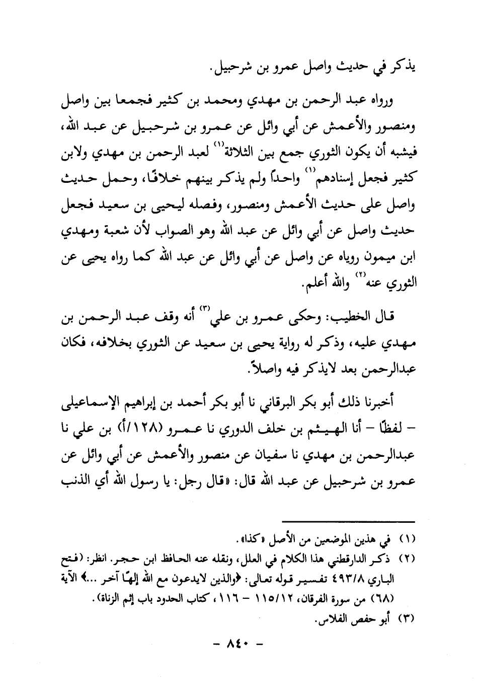 أخبرنا ذَلِكَ أَبُو بَكْرٍ الْبَرْقَانِيُّ، نا أبو أَحْمَدُ بْنُ إِبْرَاهِيمَ الإِسْمَاعِيلِيُّ ـ لَفْظًا ـ أنا الْهَيْثَمُ بْنُ خَلَفٍ الدُّورِيُّ، نا عمرو (128/ أ) ابن عَلِيٍّ، نا عَبْدُ الرَّحْمَنِ بْنُ مَهْدِيٍّ، نا سُفْيَانُ عَنْ مَنْصُورٍ وَالأَعَمْشِ، عَنْ أَبِي وَائِلٍ، عَنْ عمرو