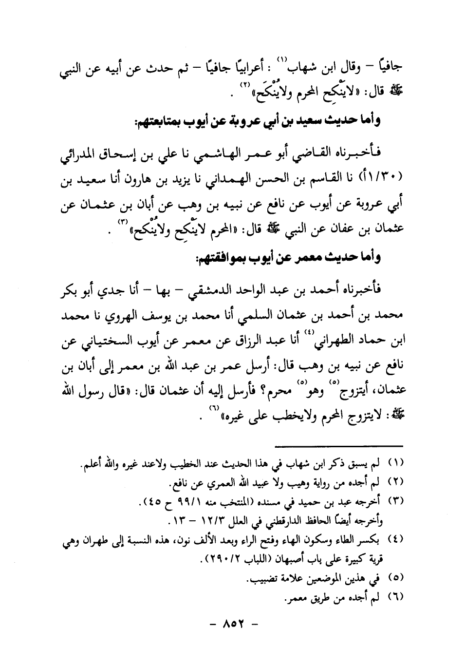 ابن يُوسُفَ الْهَرَوِيُّ، نا مُحَمَّدُ بْنُ حَمَّادٍ الطَّهْرَانِيُّ4، أنا عَبْدُ الرَّزَّاقِ عَنْ مَعْمَرٍ، عَنْ أَيُّوبَ السَّخْتِيَانِيِّ، عن نافع، عن نبيه ابن وَهْبٍ قَالَ: أَرْسَلَ عُمَرُ بْنُ عبد اللَّهِ بْنِ مَعْمَرٍ إِلَى أَبَانٍ بن عثمان؛ أَيَتَزَوَّجُ5 وَهُوَ5 مُحْرِمٌ؟ فَأَرْسَلَ إِلَيْهِ أَنَّ عُثْمَانَ قَالَ: "قَالَ رَسُولُ الله صَلَّى اللَّهُ عَلَيْهِ وَسَلَّمَ: لا يَتَزَوَّجُ الْمُحْرِمُ وَلا يَخْطُبُ على غيره" 6.