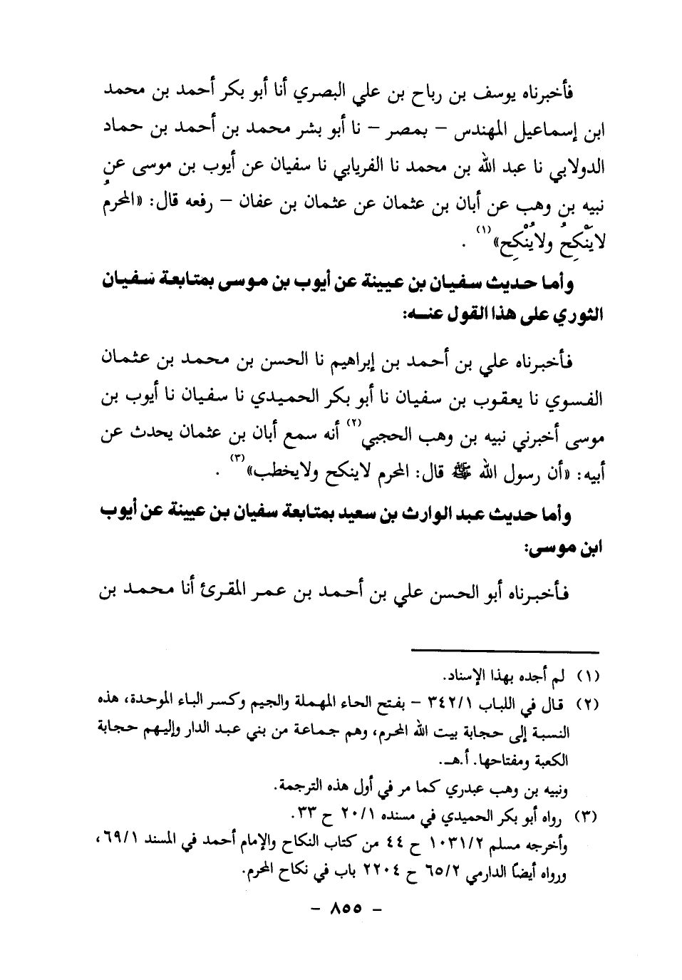 فَأَخْبَرَنَاهُ عَلِيُّ بْنُ أَحْمَدَ بْنِ إِبْرَاهِيمَ، نَا الْحَسَنُ بْنُ مُحَمَّدِ بْنِ عُثْمَانَ الْفَسَوِيُّ، نا يَعْقُوبُ بْنُ سُفْيَانَ، نا أَبُو بَكْرِ الْحُمَيْدِيُّ، نا سُفْيَانُ، نا أَيُّوبُ بْنُ مُوسَى أَخْبَرَنِي نُبَيْهُ بْنُ وَهْبٍ الْحَجَبِيُّ2 أَنَّهُ سَمِعَ أَبَانَ بْنَ عُثْمَانَ يُحَدِّثُ عَنْ أَبِيهِ: "أَنَّ رَسُولَ اللَّهِ صَلَّى اللَّهُ عَلَيْهِ وَسَلَّمَ قَالَ: الْمُحْرِمُ لا يُنْكَحُ وَلا يَخْطُبُ" 3.