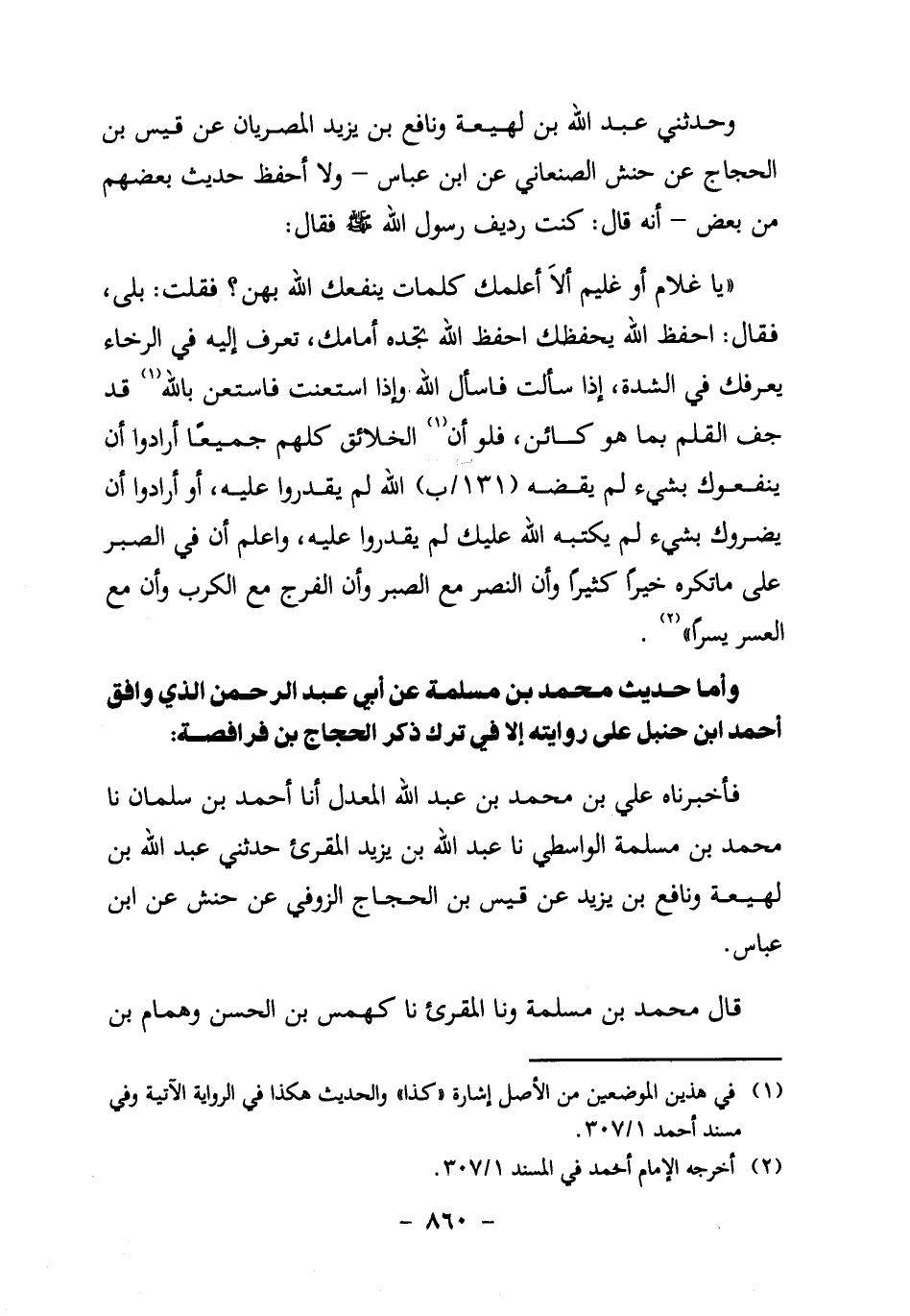 "يا غلام، أو غُلَيْمُ، أَلا أُعَلِّمُكَ كَلِمَاتٍ يَنْفَعُكَ اللَّهُ بِهِنَّ؟ فَقُلْتُ: بَلَى، فَقَالَ: احْفَظِ اللَّهَ يَحْفَظْكَ، احْفَظِ اللَّهَ تَجِدْهُ أَمَامَكَ، تَعَرَّفْ إِلَيْهِ فِي الرَّخَاءِ يَعْرِفْكَ فِي الشِّدَّةِ، إِذَا سَأَلْتَ فَاسْأَلِ اللَّهَ، وَإِذَا اسْتَعَنْتَ فَاسْتَعِنْ بِاللَّهِ1، قَدْ جَفَّ الْقَلَمُ