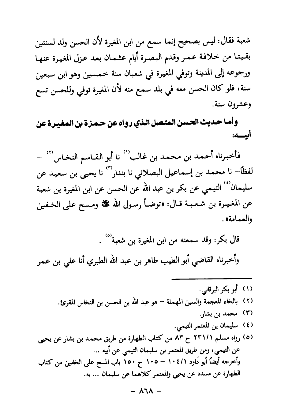 وأخرجه أيضاً أبو داود 1/ 104-105 ح 150 باب المسح على الخفين من كتاب الطهارة عن مسدد، عن يحيى والمعتمر كلاهما عن سليمان ... به.