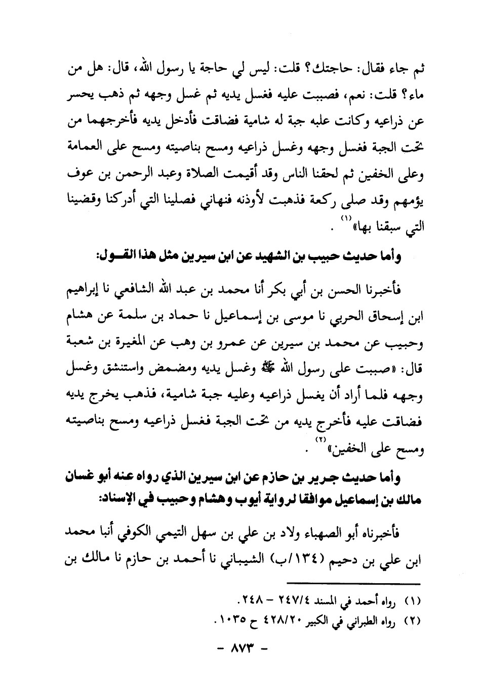 نَا حَمَّادُ بْنُ سَلَمَةَ، عَنْ هِشَامٍ وَحَبِيبٍ، عَنْ مُحَمَّدِ بْنِ سيرين، عن عمرو بن وهب، عَنِ الْمُغِيرَةِ بْنِ شُعْبَةَ قَالَ: "صَبَبْتُ عَلَى رَسُولِ اللَّهِ صَلَّى اللَّهُ عَلَيْهِ وَسَلَّمَ، وَغَسَلَ يَدَيْهِ، وَمَضْمَضَ، وَاسْتَنْشَقَ، وَغَسَلَ وَجْهَهُ، فَلَمَّا أَرَادَ أَنْ يَغْسِلَ ذِرَاعَيْهِ وَعَلَيْهِ جُبَّةٌ شَامِيَّةٌ، فَذَهَبَ يُخْرِجُ يَدَيْهِ فَضَاقَتْ عَلَيْهِ، فَأَخْرَجَ يَدَيْهِ مِنْ تَحْتِ الْجُبَّةِ، فَغَسَلَ ذِرَاعَيْهِ، وَمَسَحَ بِنَاصِيَتِهِ وَمَسَحَ عَلَى الْخُفَّيْنِ" 2.
