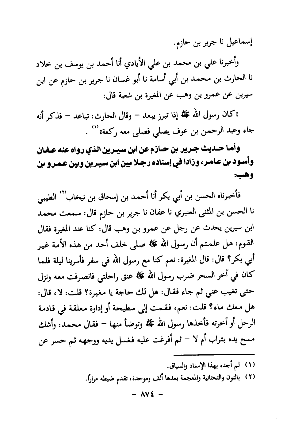 فَأَخْبَرَنَاهُ الْحَسَنُ بْنُ أَبِي بَكْرٍ، أنا أَحْمَدُ بْنُ إِسْحَاقَ بْنِ نِيخَابَ2 الطَّيْبِيُّ، نا الْحَسَنُ بْنُ الْمُثَنَّى الْعَنْبَرِيُّ، نا عَفَّانُ، نا جرير ابن حَازِمٍ قَالَ: سَمِعْتُ مُحَمَّدَ بْنَ سِيرِينَ يُحَدِّثُ عَنْ رَجُلٍ عَنْ عَمْرِو بْنِ وَهْبٍ قَالَ: كُنَّا عند المغيرة بن شعبة، فَقَالَ الْقَوْمُ: هَلْ عَلِمْتُمْ أَنَّ رسول الله صَلَّى اللَّهُ عَلَيْهِ وَسَلَّمَ صَلَّى خَلْفَ أَحَدٍ مِنْ هَذِهِ الأُمَّةِ غَيْرَ أَبِي بَكْرٍ؟ قَالَ: قَالَ الْمُغِيرَةُ: نَعَمْ، كُنَّا مَعَ رَسُولِ اللَّهِ صَلَّى اللَّهُ عَلَيْهِ وَسَلَّمَ فِي سَفَرٍ، فَأَسْرَيْنَا لَيْلَةً، فَلَمَّا كَانَ فِي آخِرِ السَّحَرِ ضَرَبَ رسول الله صَلَّى اللَّهُ عَلَيْهِ وَسَلَّمَ عُنُقَ رَاحِلَتِي، فَانْصَرَفْتُ مَعَهُ، وَنَزَلَ حَتَّى تَغَيَّبَ عَنِّي، ثُمَّ جاء فقال: هل لك حَاجَةٌ يَا مُغِيرَةُ؟ قُلْتُ: لا، قَالَ: هَلْ مَعَكَ مَاءٌ؟ قُلْتُ: نَعَمْ، فَقُمْتُ إِلَى سَطِيحَةٍ أَوْ إِدَاوَةٍ مُعَلَّقَةٍ فِي قَادِمَةِ الرَّحْلِ أَوْ أَخِرَتِهِ، فَأَخَذَهَا رَسُولُ اللَّهِ صَلَّى اللَّهُ عَلَيْهِ وَسَلَّمَ وَتَوَضَّأَ مِنْهَا ـ فَقَالَ مُحَمَّدٌ: وَأَشُكُّ مَسَحَ يَدَهُ بِتُرَابٍ أَمْ لا ـ ثُمَّ أَفْرَغْتُ عَلَيْهِ فَغَسَلَ يَدَيْهِ وَوَجْهَهُ، ثم حسر عن