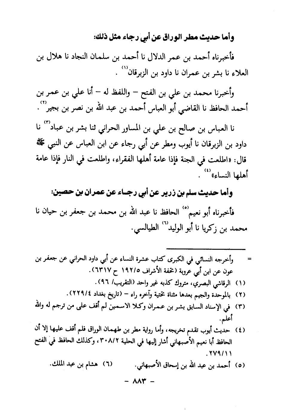 نا الْعَبَّاسُ بْنُ صَالِحِ بْنِ عَلِيِّ بْنِ الْمُسَاوِرِ الحراني، ثنا بشر بن عباد3، نا دَاوُدُ بْنُ الزِّبْرِقَانِ، نا أَيُّوبُ وَمَطَرٌ عَنْ أَبِي رَجَاءٍ، عَنِ ابْنِ الْعَبَّاسِ، عَنِ النَّبِيِّ صَلَّى اللَّهُ عَلَيْهِ وَسَلَّمَ قَالَ: "اطَّلَعْتُ فِي الْجَنَّةِ، فَإِذَا عَامَّةُ أَهْلِهَا الْفُقَرَاءَ، وَاطَّلَعْتُ فِي النَّارِ، فَإِذَا عَامَّةُ أَهْلِهَا النِّسَاءُ" 4.