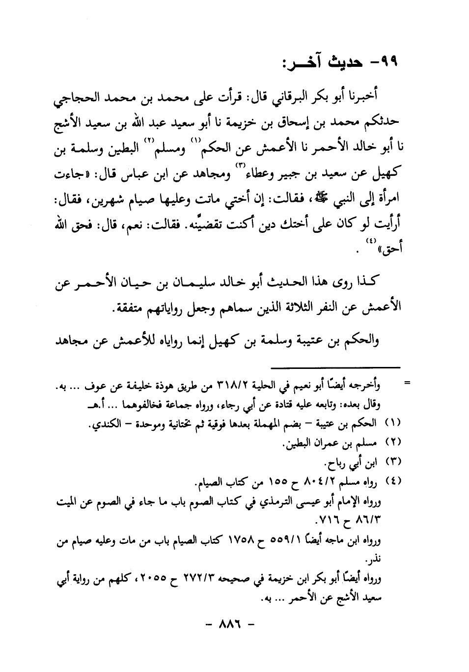 أَخْبَرَنَا أَبُو بَكْرٍ الْبَرْقَانِيُّ قَالَ: قَرَأْتُ عَلَى مُحَمَّدِ بْنِ مُحَمَّدٍ الْحَجَّاجِيِّ، حَدَّثَكُمْ مُحَمَّدُ بْنُ إِسْحَاقَ بْنِ خُزَيْمَةَ، نا أَبُو سَعِيدٍ عَبْدُ اللَّهِ بْنُ سَعِيدٍ الأَشَجُّ، نا أَبُو خَالِدٍ الأَحْمَرُ، نا الأَعْمَشُ عَنِ الْحَكَمِ1، وَمُسْلِمٌ2 الْبَطِينُ، وَسَلَمَةُ بْنُ كُهَيْلٍ عَنْ سَعِيدِ ابن جُبَيْرٍ، وَعَطَاءٍ3، وَمُجَاهِدٍ، عَنِ ابْنِ عَبَّاسٍ قَالَ: "جَاءَتِ امْرَأَةٌ إِلَى النبي صَلَّى اللَّهُ عَلَيْهِ وَسَلَّمَ فقالت: إِنَّ أُخْتِي مَاتَتْ وَعَلَيْهَا صِيَامُ شَهْرَيْنِ، فَقَالَ: أَرَأَيْتِ لَوْ كَانَ عَلَى أُخْتِكِ دَيْنٌ أَكُنْتِ تَقْضِينَهُ؟ فَقَالَتْ: نَعَمْ، قَالَ: فَحَقُّ اللَّهِ أَحَقُّ" 4.