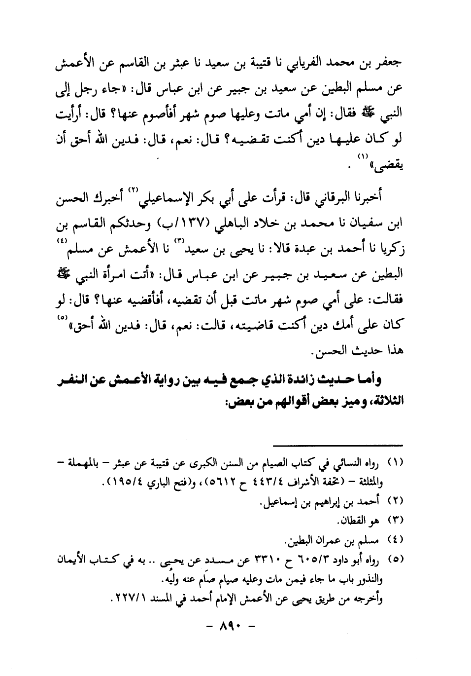 جعفر بن محمد الفريابي، نا قُتَيْبَةُ بْنُ سَعِيدٍ، نا عَبْثَرُ بْنُ الْقَاسِمِ عَنِ الأَعْمَشِ، عَنْ مُسْلِمٍ الْبَطِينِ، عَنْ سَعِيدِ بْنِ جُبَيْرٍ، عَنِ ابْنِ عَبَّاسٍ قَالَ: "جَاءَ رَجُلٌ إِلَى النَّبِيِّ صَلَّى اللَّهُ عَلَيْهِ وَسَلَّمَ فَقَالَ: إِنْ أُمِّي مَاتَتْ وَعَلَيْهَا صَوْمُ شَهْرٍ، أَفَأَصُومُ عَنْهَا؟ قَالَ: أَرَأَيْتِ لَوْ كَانَ عَلَيْهَا دَيْنٌ أَكُنْتِ تَقْضِيهِ؟ قَالَ: نَعَمْ، قَالَ: فَدَيْنُ اللَّهِ أحق أن يقضى" 1.