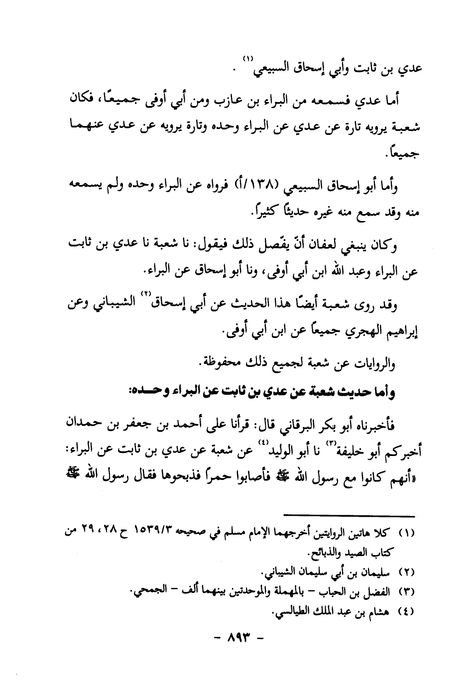 أَمَّا عَدِيٌّ فَسَمِعَهُ مِنَ البراء بن عازب ومن أَبِي أَوْفَى جَمِيعًا، فَكَانَ شُعْبَةُ يَرْوِيهِ تَارَةً عَنْ عَدِيٍّ، عَنِ الْبَرَاءِ وَحْدَهُ، وَتَارَةً يَرْوِيهِ عَنْ عَدِيٍّ عَنْهُمَا جَمِيعًا.