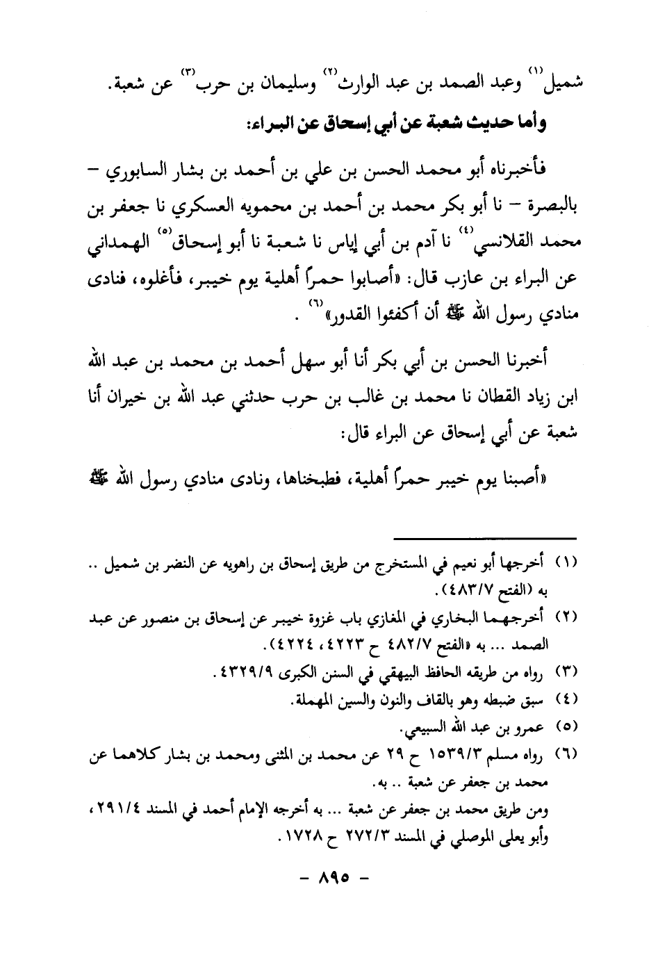 فأخبرناه أَبُو مُحَمَّدٍ الْحَسَنُ بْنُ عَلِيِّ بْنِ أَحْمَدَ بْنِ بَشَّارٍ السَّابُورِيُّ ـ بِالْبَصْرَةِ ـ نا أَبُو بَكْرٍ مُحَمَّدُ بْنُ أَحْمَدَ بْنِ مَحْمَوِيَةَ الْعَسْكَرِيُّ، نا جَعْفَرُ بْنُ مُحَمَّدٍ الْقَلانِسِيُّ4، نا آدَمُ بْنُ أَبِي إِيَاسٍ، نا شُعْبَةُ، نا أَبُو إِسْحَاقَ5 الْهَمْدَانِيُّ عَنِ الْبَرَاءِ بْنِ عَازِبٍ قَالَ: "أَصَابُوا حُمُرًا أَهْلِيَّةً يَوْمَ خيبر، فأغلوه، فَنَادَى مُنَادِي رَسُولِ اللَّهِ صَلَّى اللَّهُ عَلَيْهِ وَسَلَّمَ؛ أَنْ أَكْفِئُوا القدور" 6.
