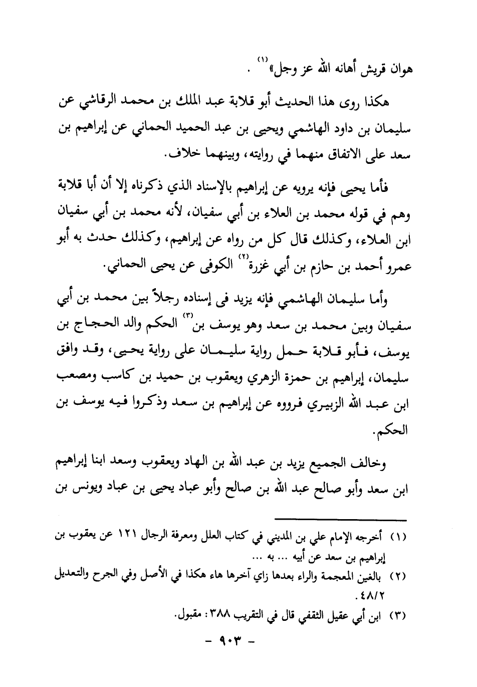 هَكَذَا رَوَى هَذَا الْحَدِيثَ أَبُو قِلابَةَ عَبْدُ الْمَلِكِ بْنُ مُحَمَّدٍ الرَّقَاشِيُّ عَنْ سُلَيْمَانَ بْنِ دَاوُدَ الْهَاشِمِيِّ وَيَحْيَى بْنِ عَبْدِ الْحَمِيدِ الْحِمَّانِيِّ عَنْ إِبْرَاهِيمَ بْنِ سَعْدٍ عَلَى الاتِّفَاقِ مِنْهُمَا فِي رِوَايَتِهِ، وَبَيْنَهُمَا خِلافٌ.