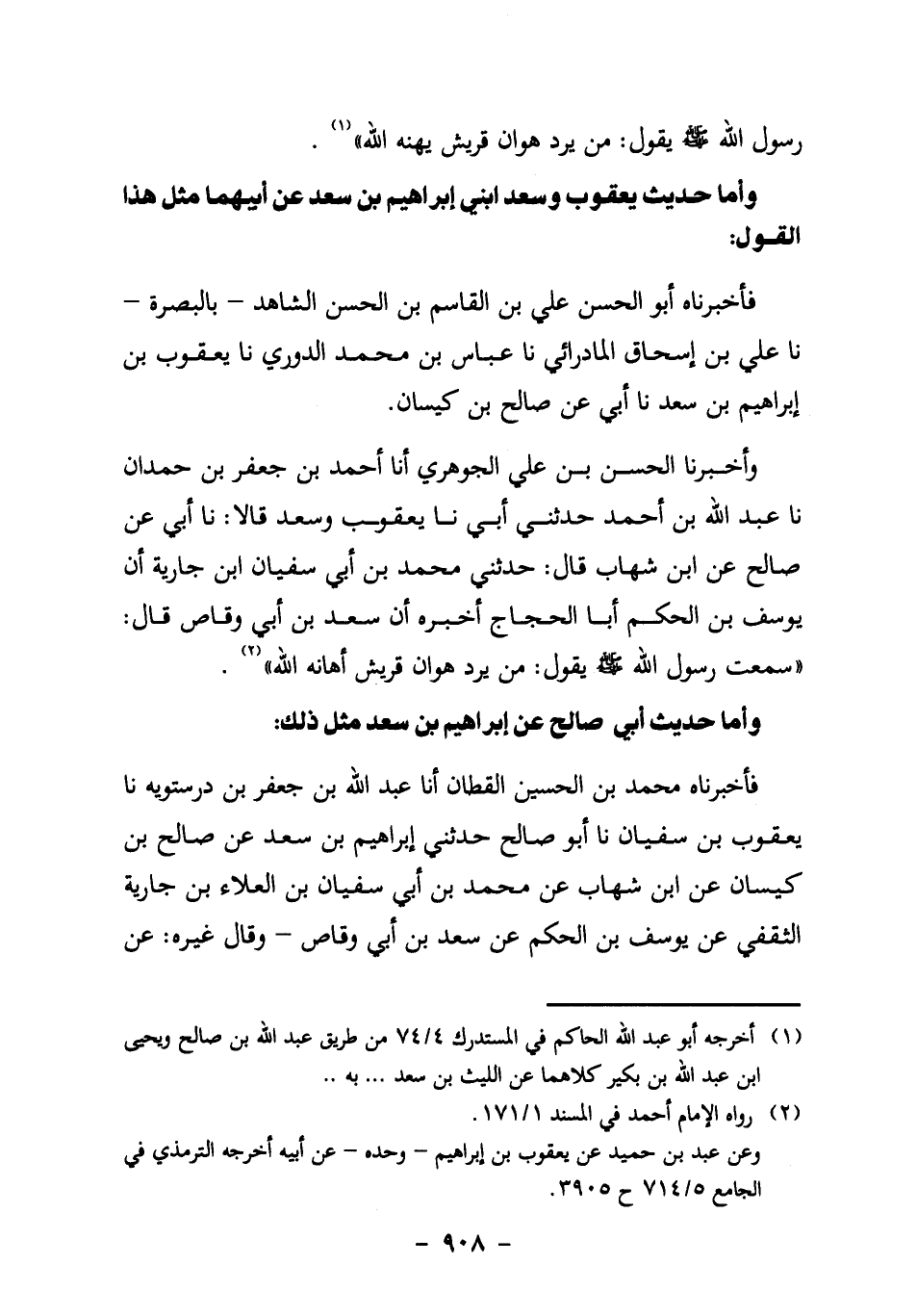وأخبرنا الْحَسَنُ بْنُ عَلِيٍّ الْجَوْهَرِيُّ، أنا أَحْمَدُ بْنُ جَعْفَرِ بْنِ حَمْدَانَ، نا عَبْدُ اللَّهِ بْنُ أَحْمَدَ، حَدَّثَنِي أَبِي، نا يَعْقُوبُ وَسَعْدٌ قَالا: نا أَبِي عَنْ صَالِحٍ، عَنِ ابْنِ شِهَابٍ قَالَ: حَدَّثَنِي مُحَمَّدُ بْنُ أَبِي سُفْيَانَ بْنِ جَارِيَةَ أَنَّ يُوسُفَ بْنَ الْحَكَمِ أَبَا الْحَجَّاجِ أَخْبَرَهُ أَنَّ سَعْدَ بْنَ أَبِي وَقَّاصٍ قَالَ: "سَمِعْتُ رسول الله صَلَّى اللَّهُ عَلَيْهِ وَسَلَّمَ يَقُولُ: مَنْ يُرِدْ هَوَانَ قُرَيْشٍ أَهَانَهُ اللَّهُ" 2.
