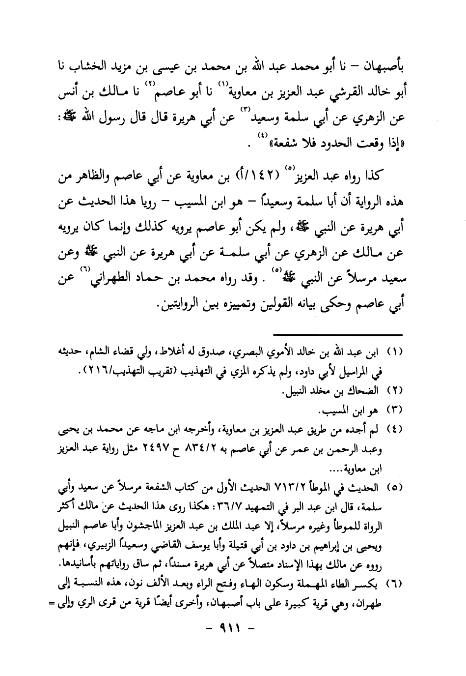 بِأَصْبَهَانَ ـ نَا أَبُو مُحَمَّدٍ عَبْدُ اللَّهِ بْنُ مُحَمَّدِ بْنِ عِيسَى بن مزيد الخشاب، نا أَبُو خَالِدٍ الْقُرَشِيُّ عَبْدُ الْعَزِيزِ بْنُ مُعَاوِيَةَ1، نا أَبُو عَاصِمٍ2، نا مَالِكُ بْنُ أَنَسٍ عَنِ الزُّهْرِيِّ، عَنْ أَبِي سَلَمَةَ وَسَعِيدٍ3، عَنْ أَبِي هُرَيْرَةَ قَالَ: قَالَ رَسُولُ اللَّهِ صَلَّى اللَّهُ عَلَيْهِ وَسَلَّمَ: "إِذَا وَقَعَتِ الْحُدُودُ فَلا شُفْعَةَ" 4.