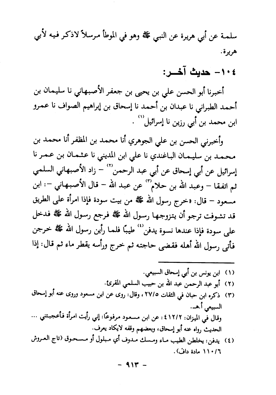 نا عُثْمَانُ بْنُ عُمَرَ، نا إِسْرَائِيلُ، عَنْ أَبِي إِسْحَاقَ، عَنْ أَبِي عَبْدِ الرَّحْمَنِ2 ـ زَادَ الأَصْبَهَانِيُّ: السُّلَمِيَّ، ثم اتفقا ـ وعبد الله ابن حَلامٍ3، عَنْ عَبْدِ اللَّهِ ـ قَالَ الأَصْبَهَانِيُّ: ابْنُ مَسْعُودٍ ـ قَالَ: "خَرَجَ رسول الله صَلَّى اللَّهُ عَلَيْهِ وَسَلَّمَ
