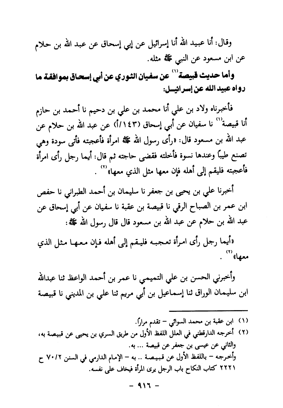 فأخبرناه وِلادُ بْنُ عَلِيٍّ، أنا مُحَمَّدُ بْنُ عَلِيِّ بْنِ دُحَيْمٍ، نا أَحْمَدُ بْنُ حَازِمٍ، أنا قَبِيصَةُ1، نا سُفْيَانُ عَنْ أَبِي إِسْحَاقَ (143/أ) عن عبد الله بن حلام، عن عبد الله بن مسعود قَالَ: "رَأَى رَسُولُ اللَّهِ صَلَّى اللَّهُ عَلَيْهِ وَسَلَّمَ امْرَأَةً فَأَعْجَبَتْهُ، فأتى سودة وهي تصنع طيباً وَعِنْدَهَا نِسْوَةٌ، فَأَخْلَتْهُ فَقَضَى حَاجَتَهُ، ثُمَّ قَالَ: أَيُّمَا رَجُلٍ رَأَى امْرَأَةً فَأَعْجَبَتْهُ فَلْيَقُمْ