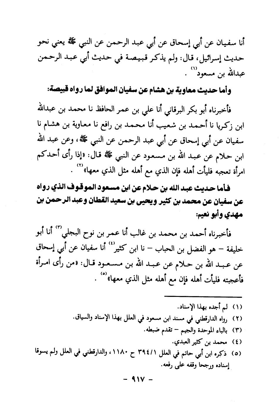 فأخبرناه أَحْمَدُ بْنُ مُحَمَّدِ بْنِ غَالِبٍ، أنا عمر بن نوح البجلي3، أنا أبو خليفة ـ هو الفضل بن الحباب ـ نا ابن كثير4، أنا سُفْيَانُ، عَنْ أَبِي إِسْحَاقَ، عن عبد الله بن حلام، عن عبد الله بن مسعود قال: "من رأى امرأة فأعجبته فليأت أهله، فإن مع أهله مثل الذي معها" 5.