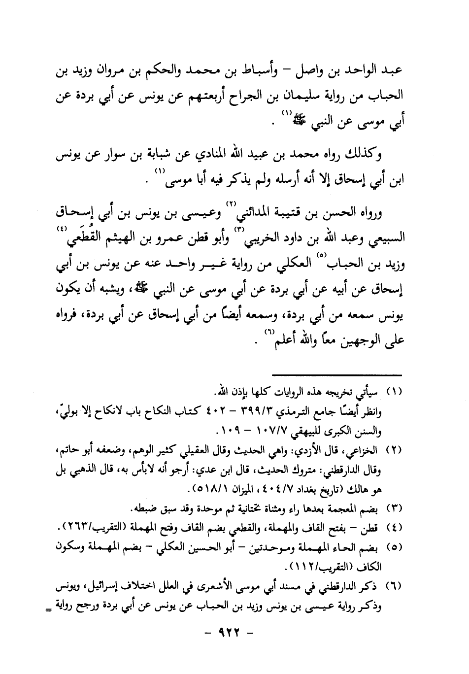 عَبْدُ الْوَاحِدِ بْنُ وَاصِلٍ ـ وَأَسْبَاطُ بْنُ مُحَمَّدٍ وَالْحَكَمُ بْنُ مَرْوَانَ وَزَيْدُ بْنُ الْحُبَابِ مِنْ رِوَايَةِ سُلَيْمَانَ بْنِ الْجَرَّاحِ أَرْبَعَتُهُمْ عَنْ يُونُسَ، عَنْ أَبِي بُرْدَةَ، عَنْ أَبِي مُوسَى، عَنِ النَّبِيِّ صَلَّى اللَّهُ عَلَيْهِ وَسَلَّمَ1.