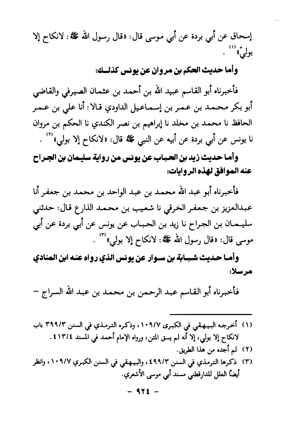فَأَخْبَرَنَاهُ أَبُو الْقَاسِمِ عُبَيْدُ اللَّهِ بْنُ أَحْمَدَ بْنِ عُثْمَانَ الصَّيْرَفِيُّ وَالْقَاضِي أَبُو بَكْرٍ مُحَمَّدُ بْنُ عُمَرَ بْنِ إِسْمَاعِيلَ الدَّاوُدِيُّ قَالا: أنا عَلِيُّ بْنُ عُمَرَ الْحَافِظُ، نا مُحَمَّدُ بْنُ مَخْلَدٍ، نا إِبْرَاهِيمُ بْنُ نَصْرٍ الْكِنْدِيُّ، نا الْحَكَمُ بْنُ مَرْوَانَ، نا يُونُسُ، عن أبي بردة، عَنِ النَّبِيِّ صَلَّى اللَّهُ عَلَيْهِ وَسَلَّمَ قَالَ: "لا نِكَاحَ إِلا بِوَلِيٍّ" 2.