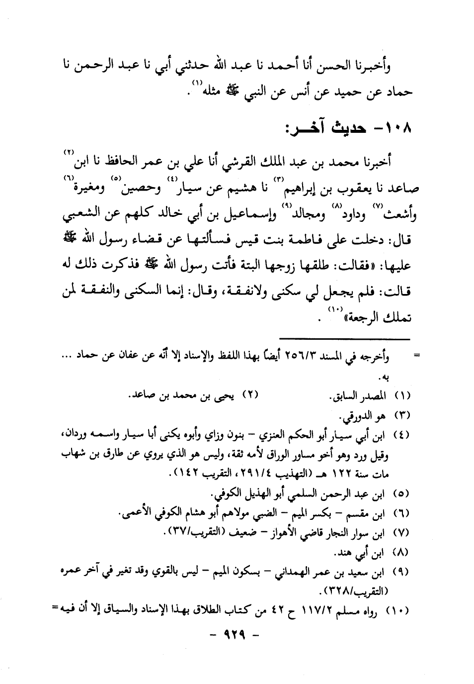 10 رواه مسلم 2/ 117 ح 42 من كتاب الطلاق بهذا الإسناد والسياق، إلا أنه فيه زيادة "وأمرني أن أعتد في بيت ابن أم مكتوم"، وهذه الزيادة في حديث داود بن أبي هند كما صرح بذلك الترمذي في روايته لهذا الحديث بهذا الإسناد والسياق 3/ 476 كتاب الطلاق باب ما جاء في المطلقة ثلاثاً لا سكنى لها ولا نفقة.