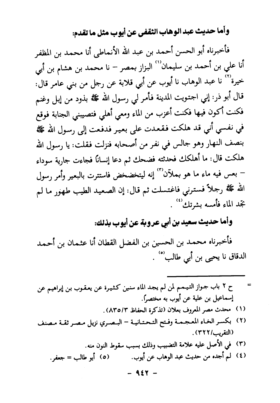نا مُحَمَّدُ بْنُ هِشَامِ بْنِ أَبِي خَيْرَةَ2، نا عَبْدُ الْوَهَّابِ، نَا أَيُّوبُ عَنْ أَبِي قِلابَةَ، عَنْ رَجُلٍ مِنْ بَنِي عَامِرٍ، قَالَ: قَالَ أَبُو ذَرٍّ: إِنِّي اجْتَوَيْتُ الْمَدِينَةَ، فَأَمَرَ لِي رَسُولُ الله صَلَّى اللَّهُ عَلَيْهِ وَسَلَّمَ بِذَوْدٍ مِنْ إِبِلٍ وَغَنَمٍ، فَكُنْتُ أَكُونُ فِيهَا، فَكُنْتُ أَعْزُبُ عَنِ الْمَاءِ وَمَعِي أَهْلِي، فَتُصِيبُنِي الْجَنَابَةُ، فَوَقَعَ فِي نَفْسِي أَنِّي قَدْ هَلَكْتُ، فَقَعَدْتُ عَلَى بَعِيرٍ فَدَفَعْتُ إِلَى رَسُولِ اللَّهِ صَلَّى اللَّهُ عَلَيْهِ وَسَلَّمَ بِنِصْفِ النَّهَارِ وَهُوَ جَالِسٌ فِي نَفَرٍ مِنْ أَصْحَابِهِ، فَنَزَلْتُ فَقُلْتُ: يَا رَسُولَ اللَّهِ، هَلَكْتُ، قَالَ: مَا أَهْلَكَكَ؟ فَحَدَّثْتُهُ، فَضَحِكَ، ثُمَّ دَعَا إِنْسَانًا، فَجَاءَتْ جَارِيَةٌ سَوْدَاءُ بِعَسٍّ فِيهِ مَاءٌ مَا هُوَ بِمَلآنَ3، إِنَّهُ لَيَتَخَضْخَضُ، فَاسْتَتَرْتُ بِالْبَعِيرِ، وَأَمَرَ رَسُولُ اللَّهِ صَلَّى اللَّهُ عَلَيْهِ وَسَلَّمَ رَجُلا فَسَتَرَنِي، فَاغْتَسَلْتُ، ثُمَّ قَالَ: إِنَّ الصَّعِيدَ الطَّيِّبَ طَهُورٌ مَا لَمْ تجد الماء، فأمسه بشرتك" 4.