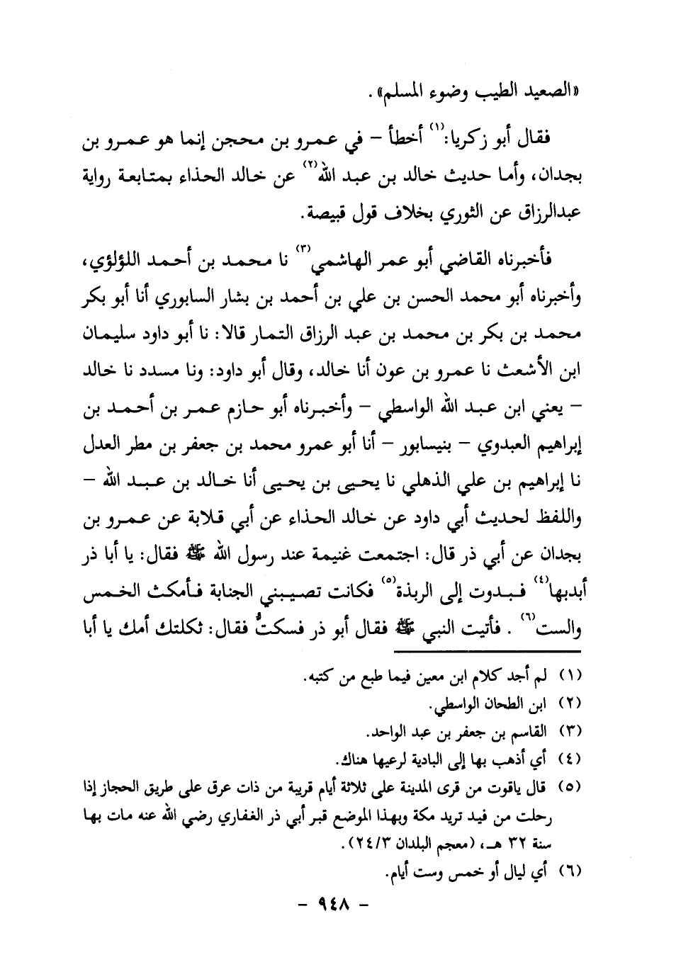 عَنْ عَمْرِو بْنِ بُجْدَانَ، عَنْ أَبِي ذَرٍّ قَالَ: اجْتَمَعَتْ غَنِيمَةٌ عِنْدَ رَسُولِ اللَّهِ صَلَّى اللَّهُ عَلَيْهِ وَسَلَّمَ فَقَالَ: يا أبا ذر، أبدها4، فَبَدَوْتُ إِلَى الرَّبَذَةِ5، فَكَانَتْ تُصِيبُنِي الْجَنَابَةُ فَأَمْكُثُ الْخَمْسَ وَالسِّتَّ6، فَأَتَيْتُ النبي صَلَّى اللَّهُ عَلَيْهِ وَسَلَّمَ، فَقَالَ: