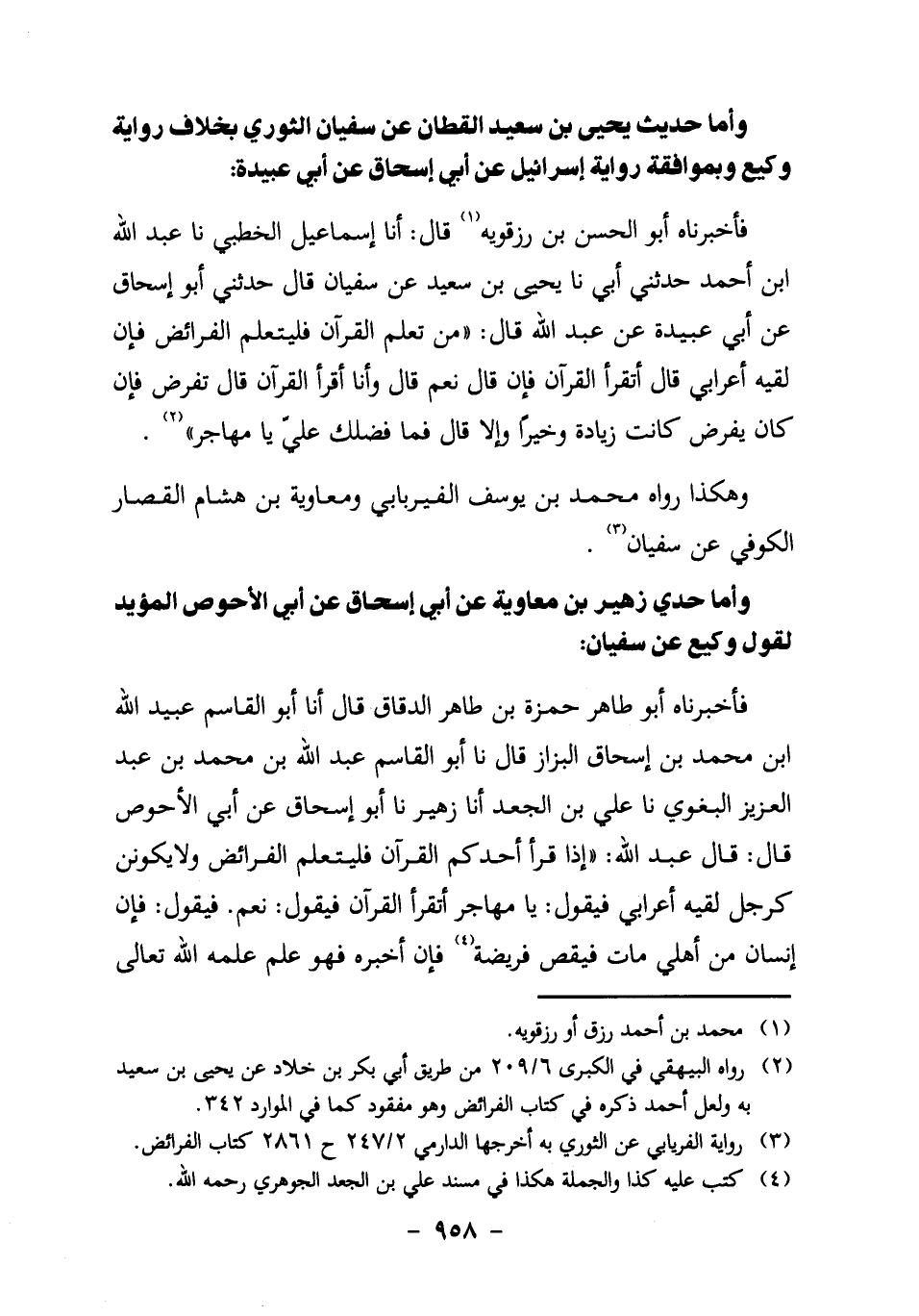 عَنْ سفيان قال: حدثني أبو إسحاق، عن أبي عبيدة، عن عبد الله قال: "من تعلم القرآن فليتعلم الفرائض، فإن لقيه أعرابي قال: أتقرأ القرآن؟ فإن قال: نعم، قال: وأنا أقرأ القرآن، قال: تفرض؟ فإن كان يفرض كانت زيادة وخيرا، وإلا قال: فما فضلك علي يا مهاجر"2.