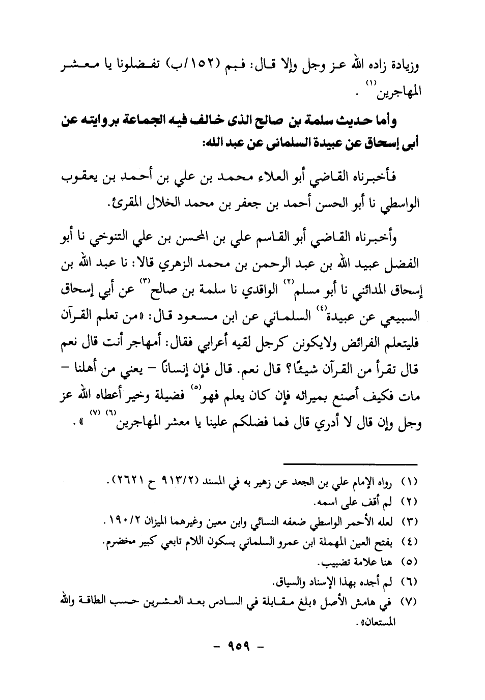 وأخبرناه الْقَاضِي أَبُو الْقَاسِمِ عَلِيُّ بْنُ المحسن بن علي التنوخي، نا أَبُو الْفَضْلِ عُبَيْدُ اللَّهِ بْنُ عبد الرحمن بن محمد الزهري، قالا: نا عبد الله بن إسحاق المدائني، نا أبو مسلم2 الواقدي، نا سلمة بن صالح3 عن أبي إسحاق السبيعي، عن عبيدة4 السلماني، عن ابن مسعود قال: "من تعلم القرآن فليتعلم الفرائض، ولا يكونن كرجل لقيه أعرابي، فقال: أمهاجر أنت؟ قال: نعم، قال: تقرأ من القرآن شيئا؟ قال: نعم. قال: فإن إنسانا ـ يعني من أهلنا ـ مات، فكيف أصنع بميراثه؟ فإن كان يعلم فهو5 فضيلة وخير أعطاه الله عز وجل، وإن قال لا أدري، قال: فما فضلكم علينا