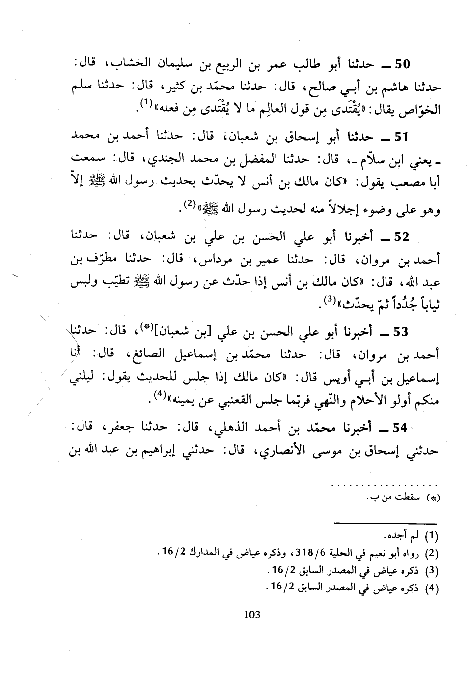 52 - أَخْبَرَنَا أَبُو عَلِيٍّ الْحَسَنُ بْنُ عَلِيِّ بْنِ شَعْبَانَ، قَالَ: حَدَّثَنَا أَحْمَدُ بْنُ مَرْوَانَ، قَالَ: حَدَّثَنَا عُمَيْرُ بْنُ مِرْدَاسٍ، قَالَ: حَدَّثَنَا مُطَرِّفُ بْنُ عَبْدِ اللَّهِ، قَالَ «كَانَ مَالِكُ بْنُ أَنَسٍ إِذَا حَدَّثَ عَنْ رَسُولِ اللَّهِ صَلَّى اللَّهُ عَلَيْهِ وَسَلَّمَ تَطَيَّبَ وَلَبِسَ ثِيَابًا جُدُدًا ثُمَّ يُحَدِّثُ»