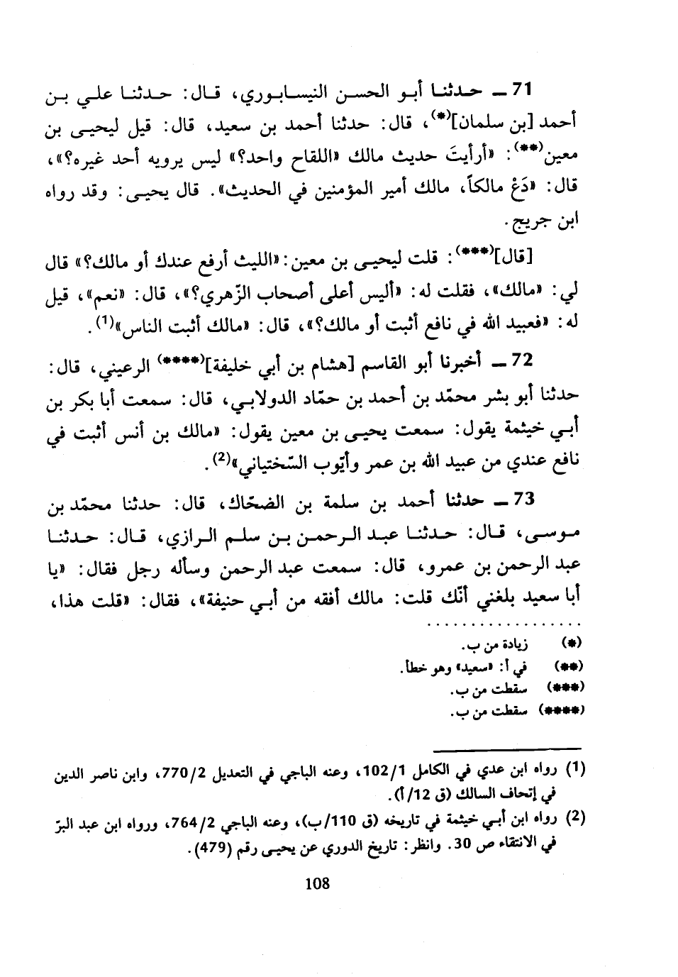 72 - أَخْبَرَنَا أَبُو الْقَاسِمِ هِشَامُ بْنُ أَبِي خَلِيفَةَ الرُّعَيْنِيُّ، قَالَ: حَدَّثَنَا أَبُو بِشْرٍ مُحَمَّدُ بْنُ أَحْمَدَ بْنِ حَمَّادٍ الدَّوْلابِيُّ، قَالَ: سَمِعْتُ أَبَا بَكْرِ بْنَ أَبِي خَيْثَمَةَ، يَقُولُ: سَمِعْتُ يَحْيَى بْنَ مَعِينٍ، يَقُولُ: «مَالِكُ بْنُ أَنَسٍ أَثْبَتُ فِي نَافِعٍ عِنْدِي مِنْ عُبَيْدِ اللَّهِ بْنِ عُمَرَ وأَيُّوبَ السَّخْتِيَانِيِّ».