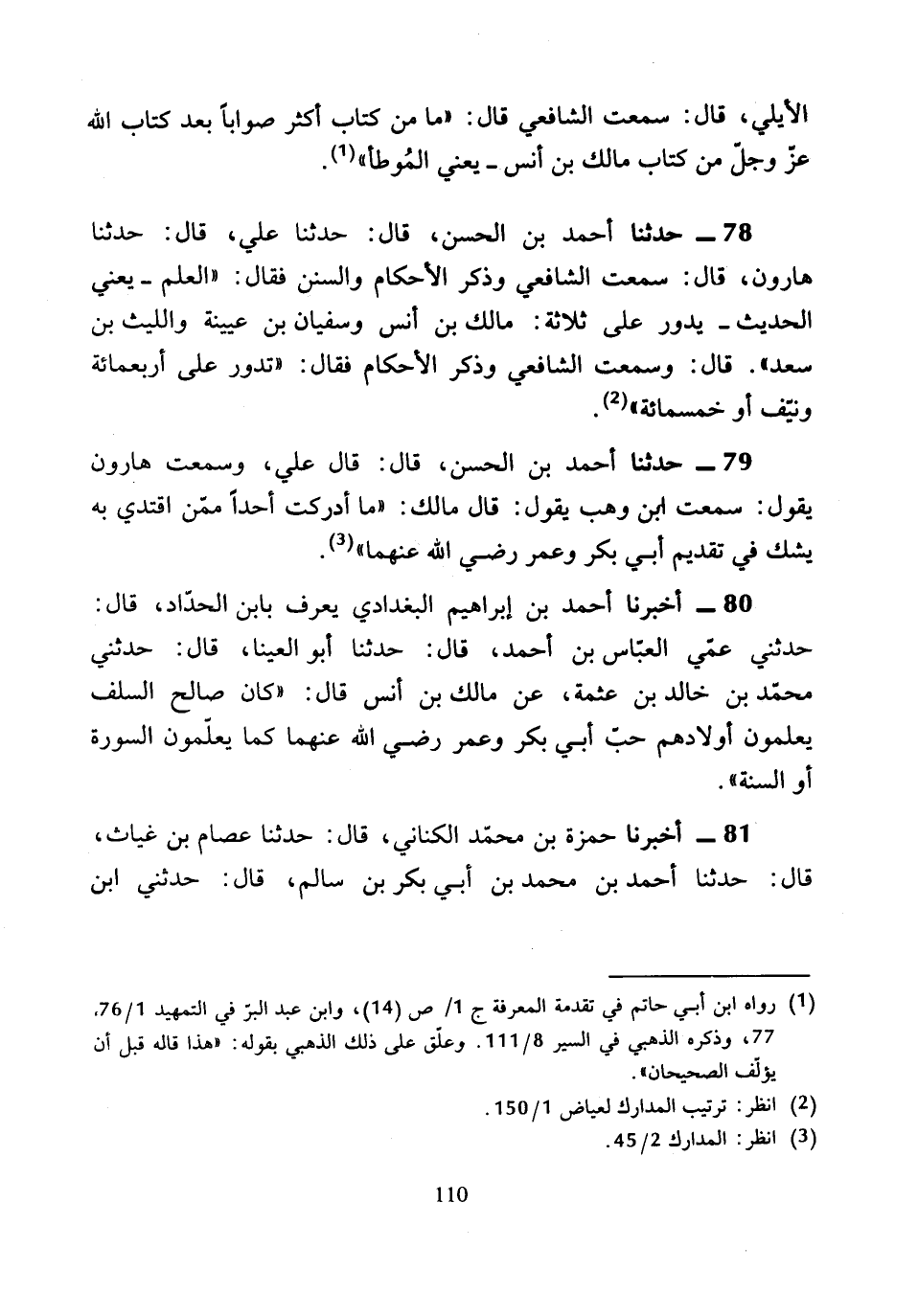 80 - أَخْبَرَنَا أَحْمَدُ بْنُ إِبْرَاهِيمَ الْبَغْدَادِيُّ يُعْرَفُ بِابْنِ الْحَدَّادِ، قَالَ: حَدَّثَنِي عَمِّي الْعَبَّاسُ بْنُ أَحْمَدَ، قَالَ: حَدَّثَنَا أَبُو الْعَيْنَا، قَالَ: حَدَّثَنِي مُحَمَّدُ بْنُ خَالِدِ بْنِ عَثْمَةَ، عَنْ مَالِكِ بْنِ أَنَسٍ، قَالَ «كَانَ صَالِحُ السَّلَفِ يُعَلِّمُونَ أَوْلادَهُمْ حُبَّ أَبِي بَكْرٍ وَعُمَرَ رَضِيَ اللَّهُ عَنْهُمَا كَمَا يُعَلِّمُونَ السُّورَةَ أَوِ السُّنَّةَ».