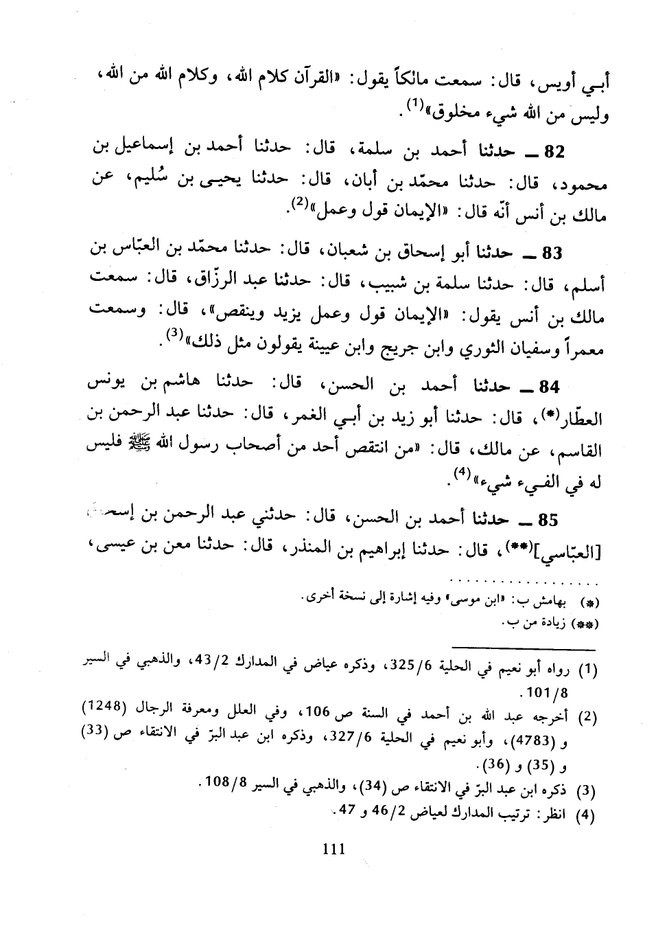 83 - حَدَّثَنَا أَبُو إِسْحَاقَ بْنُ شَعْبَانَ، قَالَ: حَدَّثَنَا مُحَمَّدُ بْنُ الْعَبَّاسِ بْنِ أَسْلَمَ، قَالَ: حَدَّثَنَا سَلَمَةُ بْنُ شَبِيبٍ، قَالَ: حَدَّثَنَا عَبْدُ الرَّزَّاقِ، قَالَ: سَمِعْتُ مَالِكَ بْنَ أَنَسٍ، يَقُولُ: «الإِيمَانُ قَوْلٌ وَعَمَلٌ يَزِيدُ وَيَنْقُصُ».