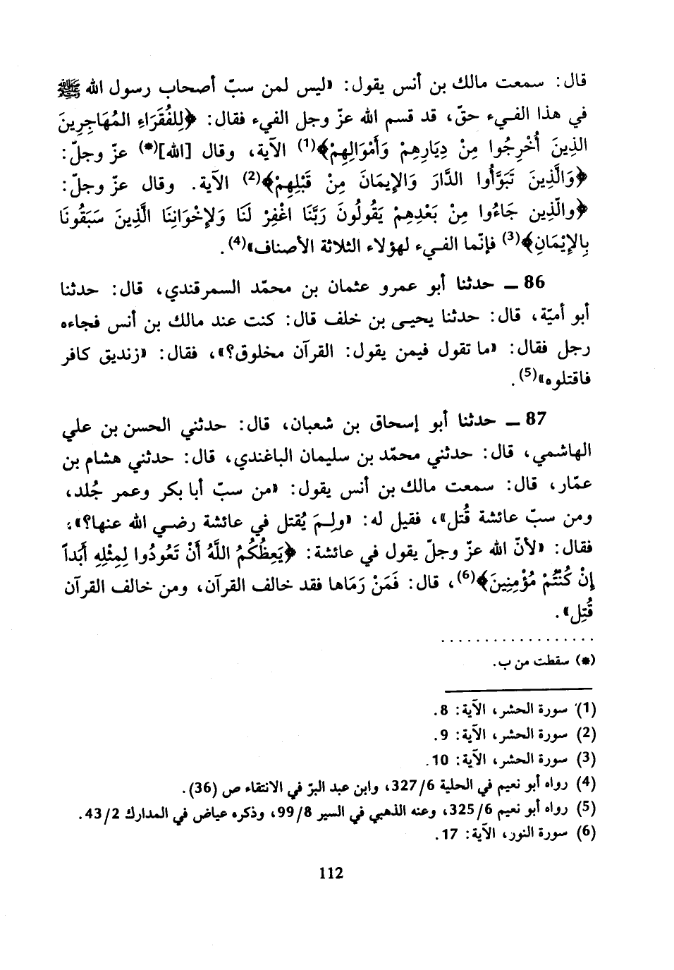 86 - حَدَّثَنَا أَبُو عَمْرٍو عُثْمَانُ بْنُ مُحَمَّدِ السَّمَرْقَنْدِيُّ، قَالَ: حَدَّثَنَا أَبُو أُمَيَّةَ، قَالَ: حَدَّثَنَا يَحْيَى بْنُ خَلَفٍ، قَالَ: كُنْتُ عِنْدَ مَالِكِ بْنِ أَنَسٍ فَجَاءَهُ رَجُلٌ، فَقَالَ " مَا تَقُولُ فِيمَنْ يَقُولُ: الْقُرْآنُ مَخْلُوقٌ؟ فَقَالَ: زِنْدِيقٌ كَافِرٌ فَاقْتُلُوهُ "