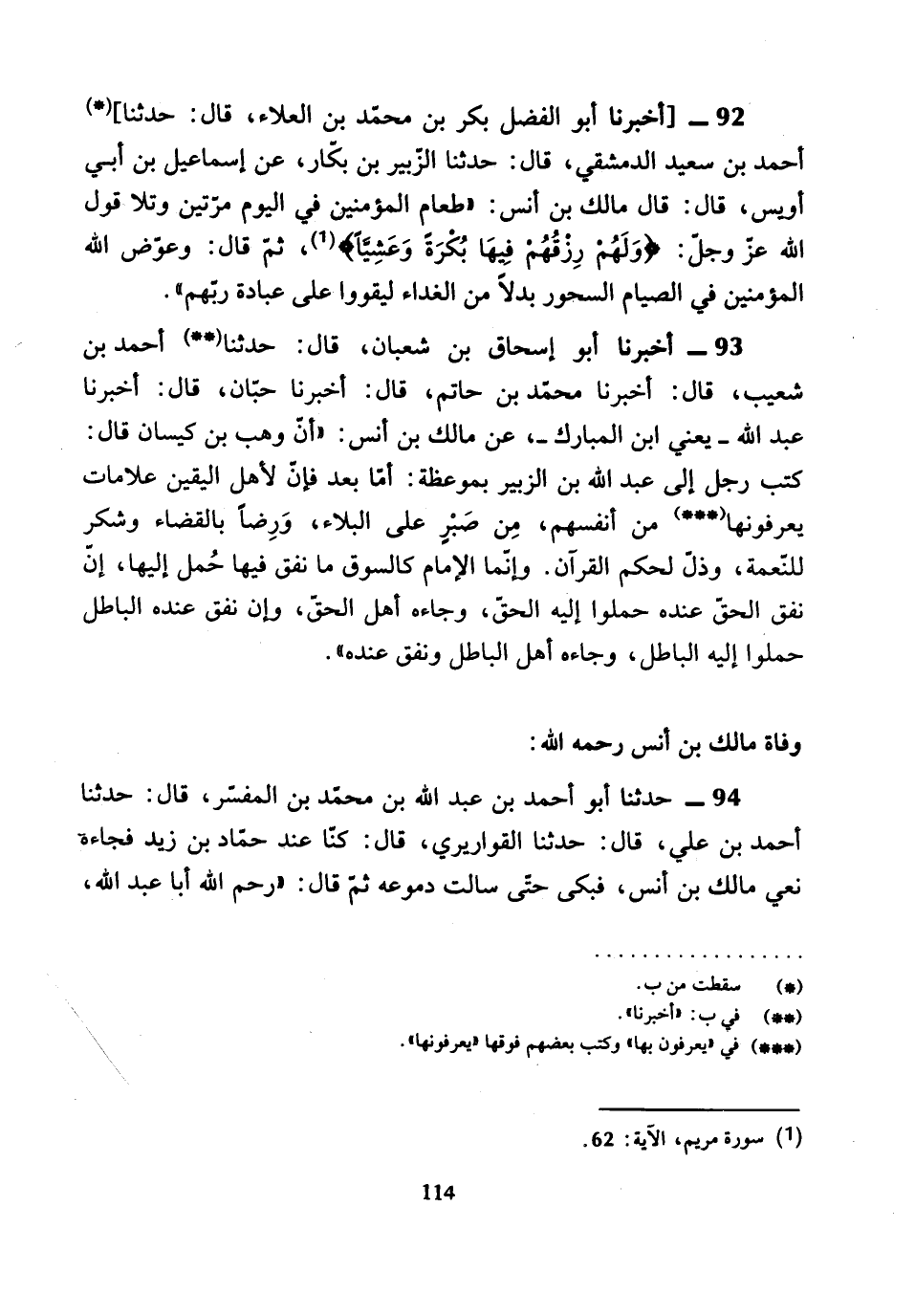 92 - أَخْبَرَنَا أَبُو الْفَضْلِ بَكْرُ بْنُ مُحَمَّدِ بْنِ الْعَلاءِ، قَالَ: حَدَّثَنَا أَحْمَدُ بْنُ سَعِيدٍ الدِّمَشْقِيُّ، قَالَ: حَدَّثَنَا الزُّبَيْرُ بْنُ بَكَّارٍ، عَنْ إِسْمَاعِيلَ بْنِ أَبِي أُوَيْسٍ، قَالَ: قَالَ مَالِكُ بْنُ أَنَسٍ " طَعَامُ الْمُؤْمِنِينَ فِي الْيَوْمِ مَرَّتَيْنِ وَتَلا قَوْلَ اللَّهِ عَزَّ وَجَلَّ: {وَلَهُمْ رِزْقُهُمْ فِيهَا بُكْرَةً وَعَشِيًّا} [مريم: 62]، ثُمَّ قَالَ: وَعَوَّضَ اللَّهُ الْمُؤْمِنِينَ فِي الصِّيَامِ السَّحُورَ بَدَلَهُ مِنَ الْغَدَاءِ لِيَقْوُوا عَلَى عِبَادَةِ رَبِّهِمْ "