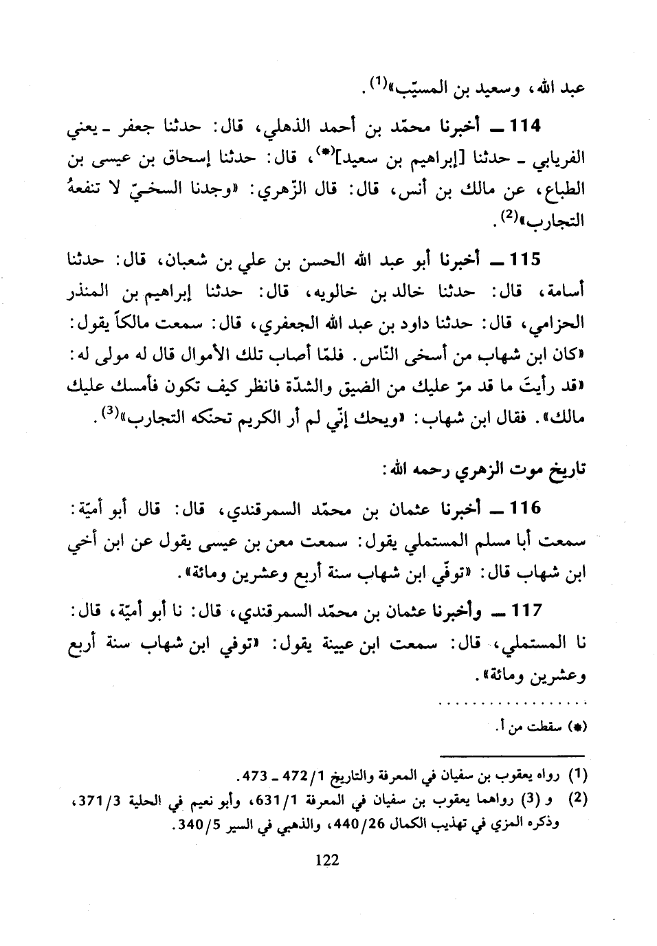 116 - أَخْبَرَنَا عُثْمَانُ بْنُ مُحَمَّدٍ السَّمَرْقَنْدِيُّ، قَالَ: قَالَ أَبُو أُمَيَّةَ: سَمِعْتُ أَبَا مُسْلِمٍ الْمُسْتَمْلِي، يَقُولُ: سَمِعْتُ مَعْنَ بْنَ عِيسَى، يَقُولُ عَنِ ابْنِ أَخِي ابْنِ شِهَابٍ، قَالَ: «تُوُفِّيَ ابْنُ شِهَابٍ سَنَةَ أَرْبَعٍ وَعِشْرِينَ وَمِائَةٍ».