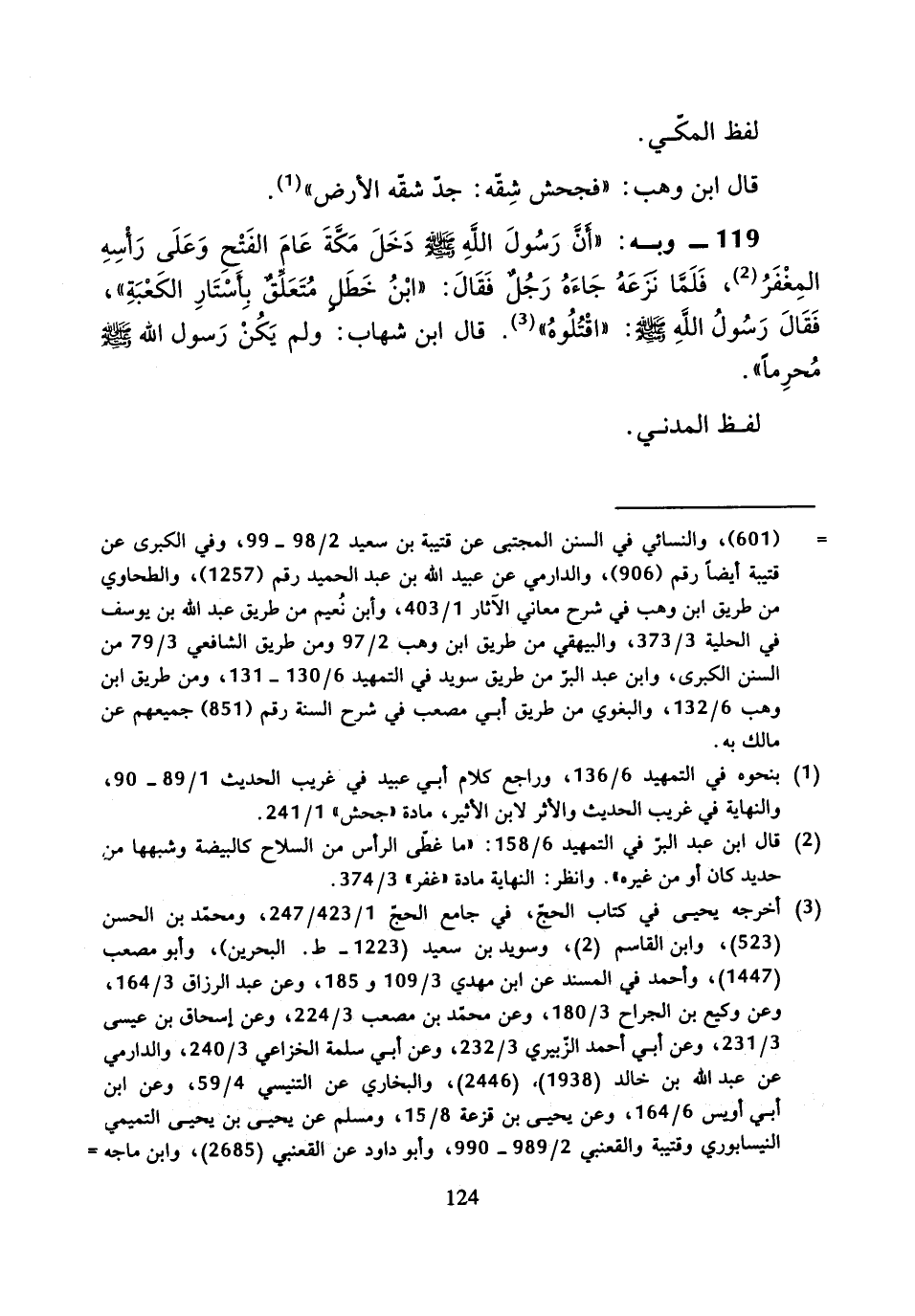 119 - وَبِهِ: " أَنَّ رَسُولَ اللَّهِ صَلَّى اللَّهُ عَلَيْهِ وَسَلَّمَ دَخَلَ مَكَّةَ عَامَ الْفَتْحِ وَعَلَى رَأْسِهِ الْمِغْفَرُ، فَلَمَّا نَزَعَهُ جَاءَهُ رَجُلٌ، فَقَالَ: «ابْنُ خَطَلٍ مُتَعَلِّقٌ بِأَسْتَارِ الْكَعْبَةِ»، فَقَالَ رَسُولُ اللَّهِ صَلَّى اللَّهُ عَلَيْهِ وَسَلَّمَ: «اقْتُلُوهُ».