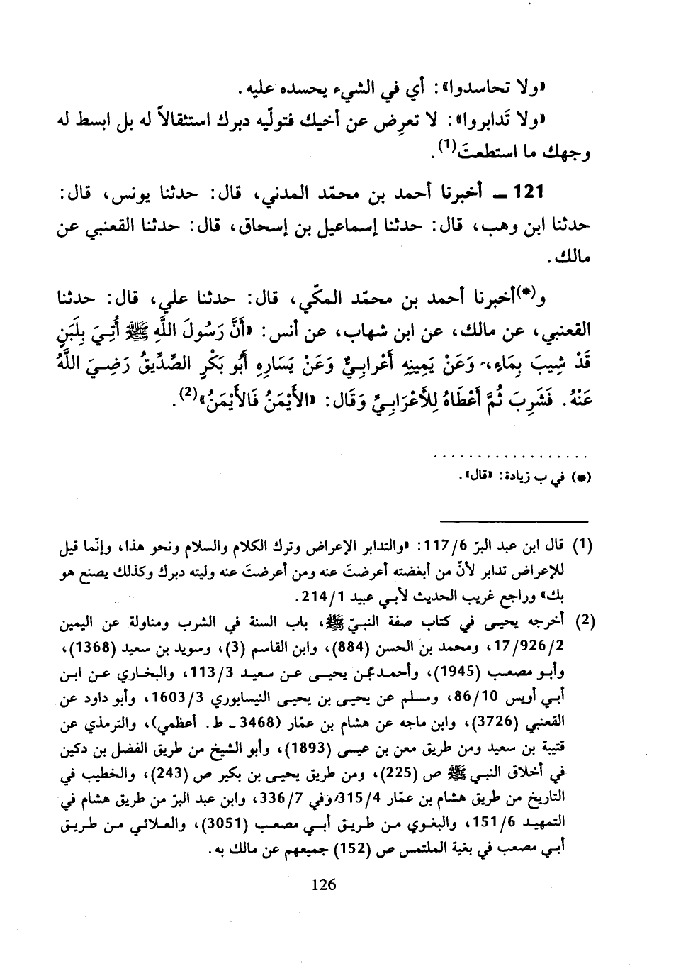 121 - أَخْبَرَنَا أَحْمَدُ بْنُ مُحَمَّدٍ الْمَدَنِيُّ، قَالَ: حَدَّثَنَا يُونُسُ، قَالَ: حَدَّثَنَا ابْنُ وَهْبٍ، وقَالَ: حَدَّثَنَا إِسْمَاعِيلُ بْنُ إِسْحَاقَ، قَالَ: حَدَّثَنَا الْقَعْنَبِيُّ عَنْ مَالِكٍ.