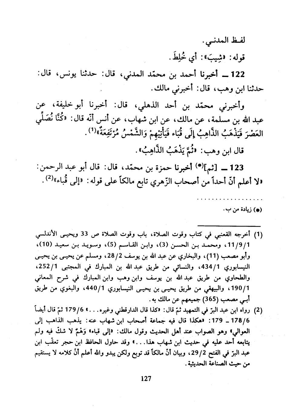 123 - ثُمَّ أَخْبَرَنَا حَمْزَةُ بْنُ مُحَمَّدٍ، قَالَ: قَالَ أَبُو عَبْدِ الرَّحْمَنِ: " لا أَعْلَمُ أَنَّ أَحَدًا مِنْ أَصْحَابِ الزُّهْرِيِّ تَابَعَ مَالِكًا عَلَى قَوْلِهِ: «إِلَى قُبَاءَ».