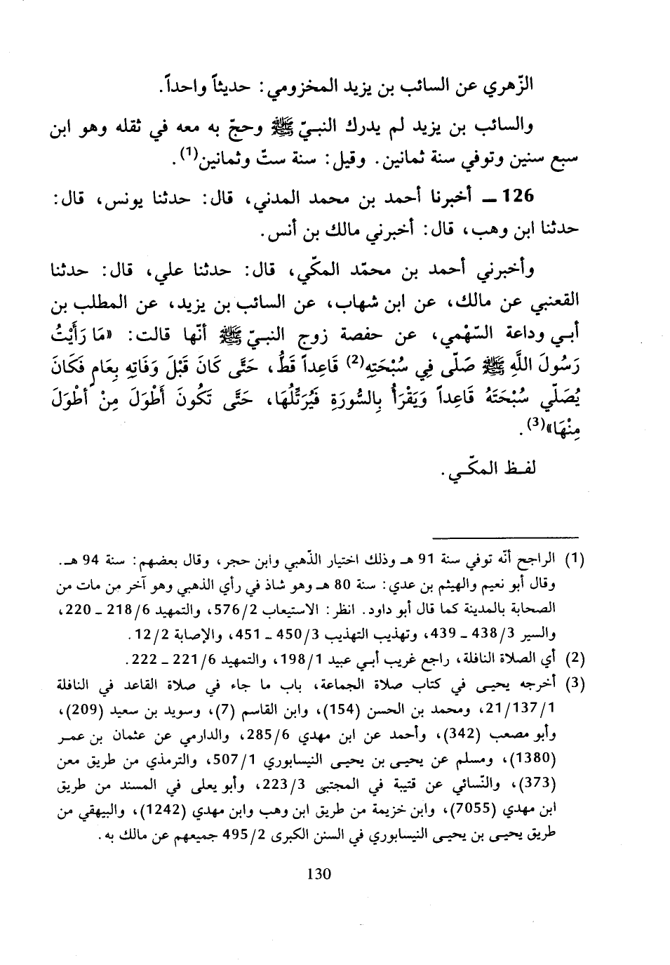 وَأَخْبَرَنِي أَحْمَدُ بْنُ مُحَمَّدٍ الْمَكِّيُّ، قَالَ: حَدَّثَنَا عَلِيٌّ، قَالَ: حَدَّثَنَا الْقَعْنَبِيُّ، عَنْ مَالِكٍ، عَنِ ابْنِ شِهَابٍ، عَنِ السَّائِبِ بْنِ يَزِيدَ، عَنِ الْمُطَّلِبِ بْنِ أَبِي وَدَاعَةَ السَّهْمِيِّ، عَنْ حَفْصَةَ زَوْجِ النَّبِيِّ صَلَّى اللَّهُ عَلَيْهِ وَسَلَّمَ، أَنَّهَا قَالَتْ: «مَا رَأَيْتُ رَسُولَ اللَّهِ صَلَّى اللَّهُ عَلَيْهِ وَسَلَّمَ صَلَّى فِي سُبْحَتِهِ قَاعِدًا قَطُّ، حَتَّى كَانَ قَبْلَ وَفَاتِهِ بِعَامٍ، فَكَانَ يُصَلِّي سُبْحَتَهُ قَاعِدًا وَيَقْرَأُ بِالسُّورَةِ فَيُرَتِّلُهَا، حَتَّى تَكُونَ أَطْوَلَ مِنْ أَطْوَلِ مِنْهَا»