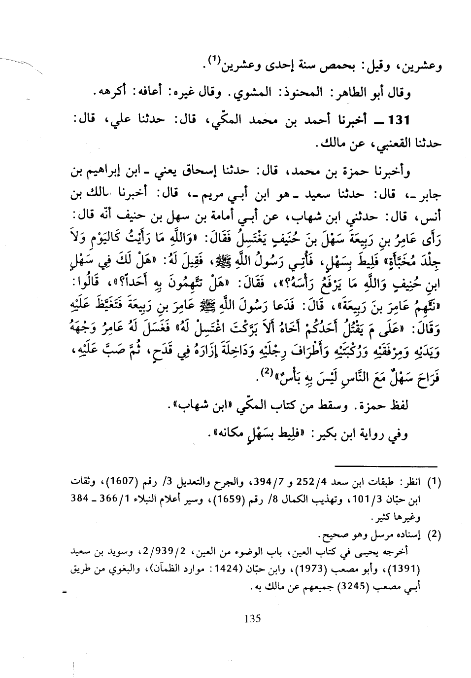 131 - أَخْبَرَنَا أَحْمَدُ بْنُ مُحَمَّدٍ الْمَكِّيُّ، قَالَ: حَدَّثَنَا عَلِيٌّ، قَالَ: حَدَّثَنَا الْقَعْنَبِيُّ، عَنْ مَالِكٍ، وَأَخْبَرَنَا حَمْزَةُ بْنُ مُحَمَّدٍ، قَالَ: حَدَّثَنَا إِسْحَاقُ يَعْنِي ابْنَ إِبْرَاهِيمَ بْنَ جَابِرٍ، قَالَ: حَدَّثَنَا سَعِيدٌ هُوَ ابْنُ أَبِي مَرْيَمَ، قَالَ: أَخْبَرَنَا مَالِكُ بْنُ أَنَسٍ، قَالَ: حَدَّثَنِي ابْنُ شِهَابٍ، عَنْ أَبِي أُمَامَةَ بْنِ سَهْلِ بْنِ حُنَيْفٍ، أَنَّهُ قَالَ: رَأَى عَامِرُ بْنُ رَبِيعَةَ سَهْلَ بْنَ حُنَيْفٍ يَغْتَسِلُ، فَقَالَ: وَاللَّهِ مَا رَأَيْتَ كَالْيَوْمِ وَلا جِلْدَ مُخَبَّأَةٍ ".