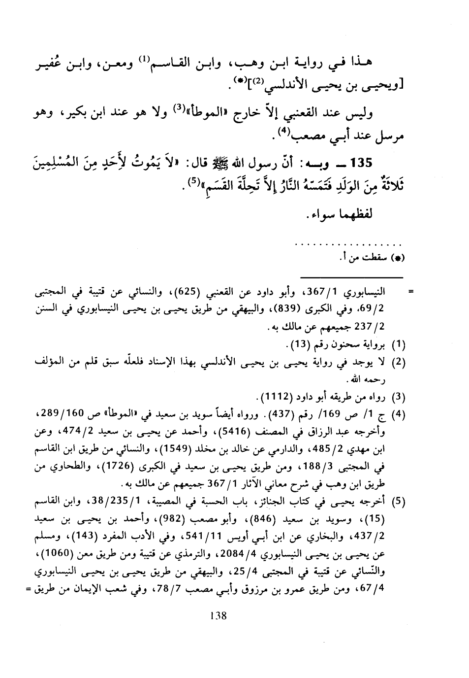135 - وَبِهِ: أَنَّ رَسُولَ اللَّهِ صَلَّى اللَّهُ عَلَيْهِ وَسَلَّمَ قَالَ: «لا يَمُوتُ لأَحَدٍ مِنَ الْمُسْلِمِينَ ثَلاثَةٌ مِنَ الْوَلَدِ فَتَمَسَّهُ النَّارُ إِلا تَحِلَّةَ الْقَسَمِ».