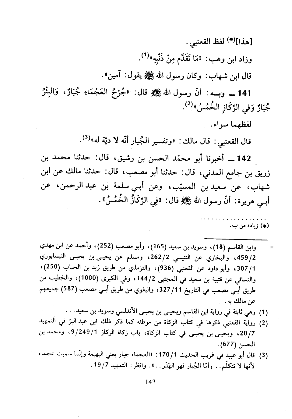 141 - وَبِهِ: أَنَّ رَسُولَ اللَّهِ صَلَّى اللَّهُ عَلَيْهِ وَسَلَّمَ قَالَ: «جُرْحُ الْعَجْمَاءِ جُبَارٌ، وَالْبِئْرُ جُبَارٌ، وَفِي الرِّكَازِ الْخُمُسُ».