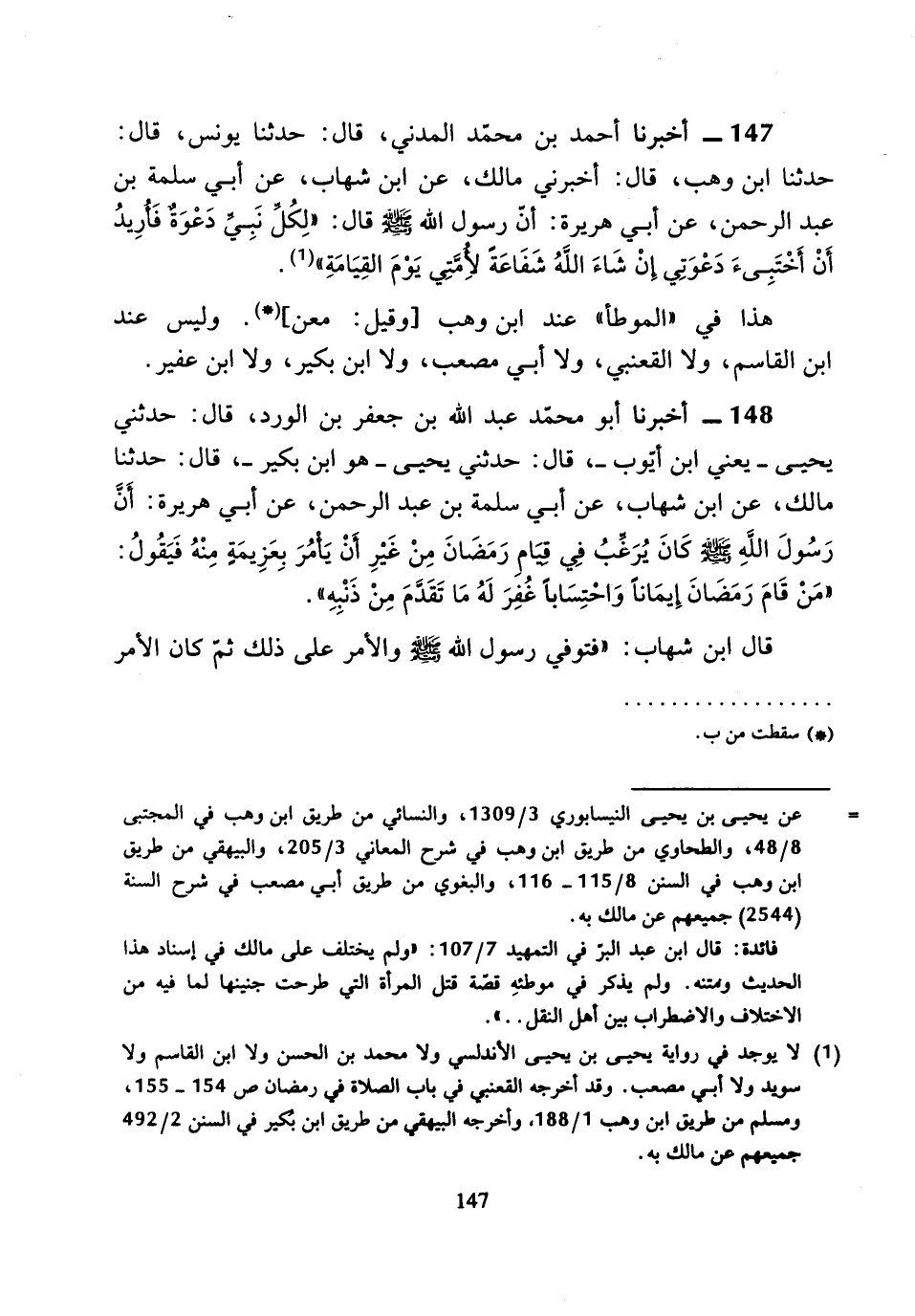 وَلَيْسَ عِنْدَ ابْنِ الْقَاسِمِ، وَلا الْقَعْنَبِيِّ، وَلا أَبِي مُصْعَبٍ، وَلا ابْنِ بُكَيْرٍ، وَلا ابْنِ عُفَيْرٍ