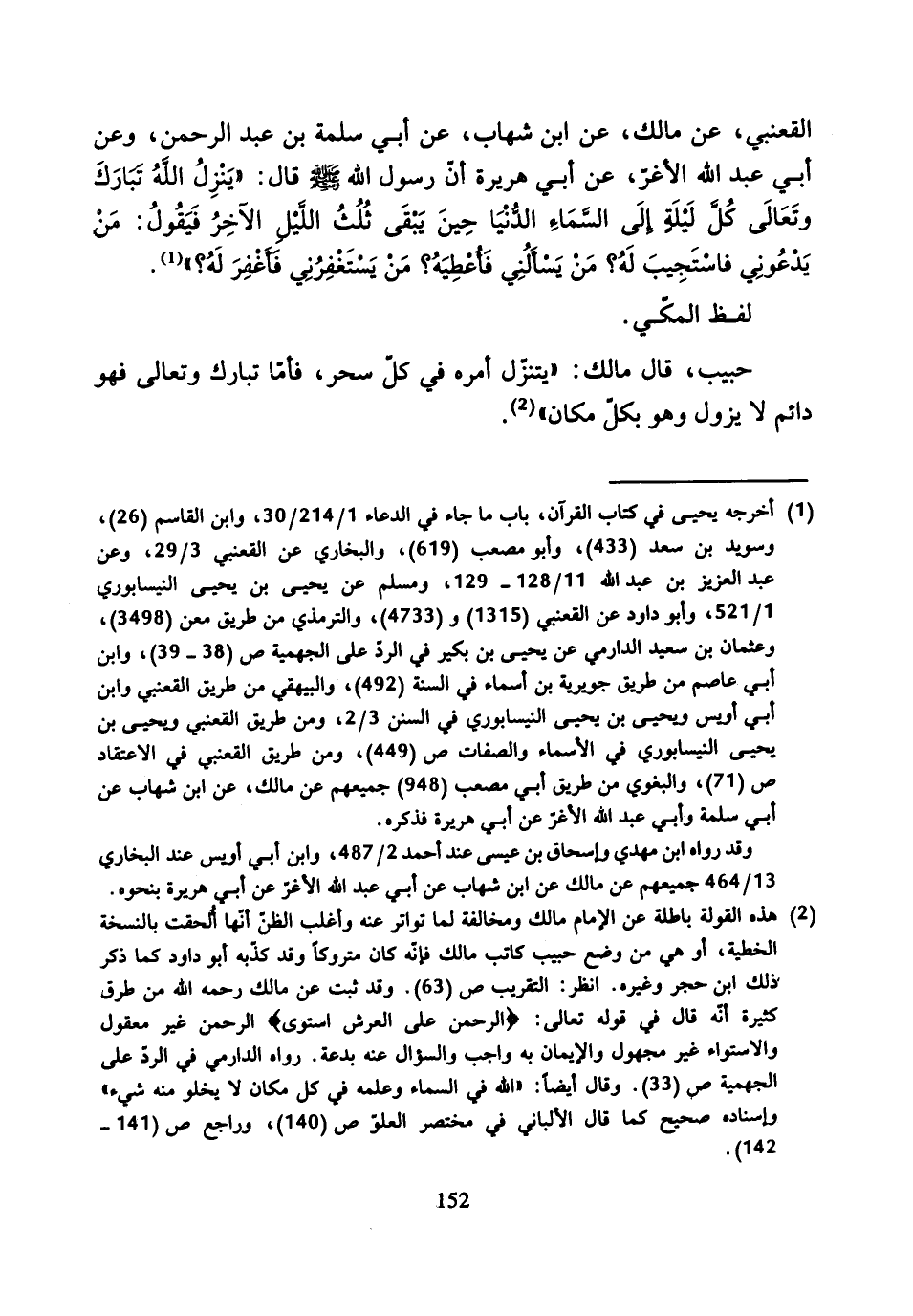 حَبِيبٌ، قَالَ مَالِكٌ: يَتَنَزَّلُ أَمْرُهُ فِي كُلِّ سَحَرٍ، فَأَمَّا تَبَارَكَ وَتَعَالَى فَهُوَ دَائِمٌ لا يَزُولُ وَهُوَ بِكُلِّ مَكَانٍ.