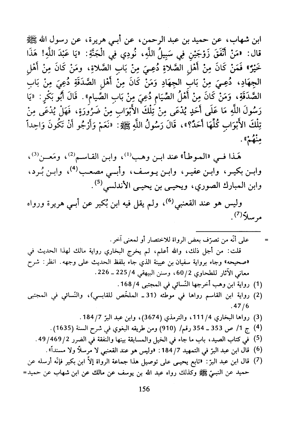 ابْنِ شِهَابٍ، عَنْ حُمَيْدِ بْنِ عَبْدِ الرَّحْمَنِ، عَنْ أَبِي هُرَيْرَةَ، عَنْ رَسُولِ اللَّهِ صَلَّى اللَّهُ عَلَيْهِ وَسَلَّمَ، قَالَ: " مَنْ أَنْفَقَ زَوْجَيْنِ فِي سَبِيلِ اللَّهِ، نُودِيَ فِي الْجَنَّةِ: يَا عَبْدَ اللَّهِ! هَذَا خَيْرٌ، فَمَنْ كَانَ مِنْ أَهْلَ الصَّلاةِ دُعِيَ مِنْ بَابِ الصَّلاةِ، وَمَنْ كَانَ مِنْ أَهْلَ الْجِهَادِ دُعِيَ مِنْ بَابِ الْجِهَادِ، وَمَنْ كَانَ مِنْ أَهْلِ الصَّدَقَةِ دُعِيَ مِنْ بَابِ الصَّدَقَةِ، وَمَنْ كَانَ مِنْ أَهْلِ الصِّيَامِ دُعِيَ مِنْ بَابِ الصِّيَامِ ".