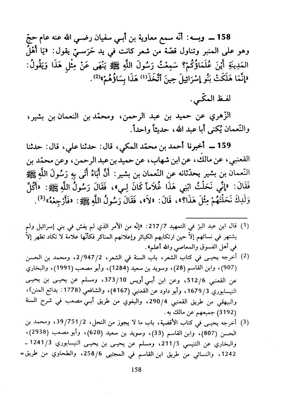 158 - وَبِهِ: أَنَّهُ سَمِعَ مُعَاوِيَةَ بْنَ أَبِي سُفْيَانَ رَضِيَ اللَّهُ عَنْهُ عَامَ حَجَّ وَهُوَ عَلَى الْمِنْبَرِ وَتَنَاوَلَ قُصَّةً مِنْ شَعْرٍ كَانَتْ فِي يَدِ حَرَسِيٍّ، يَقُولُ: يَا أَهْلَ الْمَدِينَةِ، أَيْنَ عُلَمَاؤُكُمْ؟ سَمِعْتُ رَسُولَ اللَّهِ صَلَّى اللَّهُ عَلَيْهِ وَسَلَّمَ يَنْهَى عَنْ مِثْلِ هَذَا، ويَقُولُ: «إِنَّمَا هَلَكَتْ بَنُو إِسْرَائِيلَ حِينَ اتَّخَذَ هَذَا نِسَاؤُهُمْ».