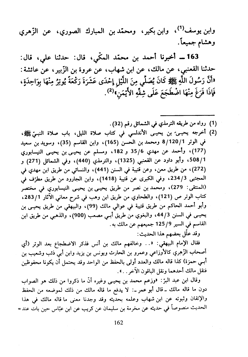 163 - أَخْبَرَنَا أَحْمَدُ بْنُ مُحَمَّدٍ الْمَكِّيُّ، قَالَ: حَدَّثَنَا عَلِيٌّ، قَالَ: حَدَّثَنَا الْقَعْنَبِيُّ، عَنْ مَالِكٍ، عَنِ ابْنِ شِهَابٍ، عَنْ عُرْوَةَ بْنِ الزُّبَيْرِ، عَنْ عَائِشَةَ، «أَنَّ رَسُولَ اللَّهِ صَلَّى اللَّهُ عَلَيْهِ وَسَلَّمَ كَانَ يُصَلِّي مِنَ اللَّيْلِ إِحْدَى عَشْرَةَ رَكْعَةً يُوتِرُ مِنْهَا بِوَاحِدَةٍ، فَإِذَا فَرَغَ مِنْهَا اضْطَجَعَ عَلَى شِقِّهِ الأَيْمَنِ».