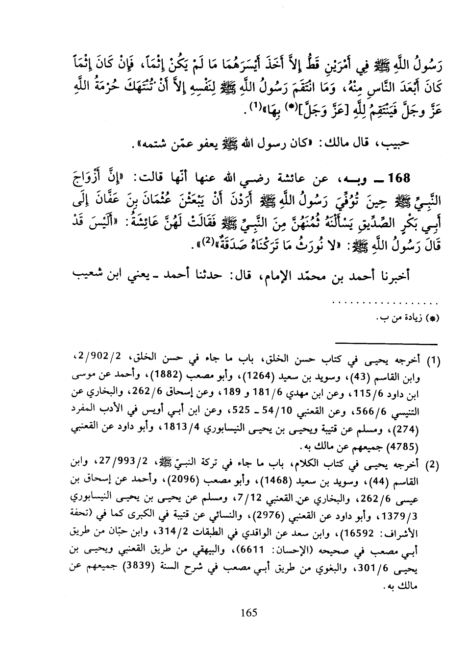 168 - وَبِهِ، عَنْ عَائِشَةَ رَضِيَ اللَّهُ عَنْهَا، أَنَّهَا قَالَتْ: " إِنَّ أَزْاوَجَ النَّبِيِّ صَلَّى اللَّهُ عَلَيْهِ وَسَلَّمَ حِينَ تُوُفِّيَ رَسُولُ اللَّهِ صَلَّى اللَّهُ عَلَيْهِ وَسَلَّمَ أَرَدْنَ أَنْ يَبْعَثْنَ عُثْمَانَ بْنَ عَفَّانَ إِلَى أَبِي بَكْرٍ الصِّدِّيقِ يَسْأَلْنَهُ ثُمُنَهُنَّ مِنَ النَّبِيِّ صَلَّى اللَّهُ عَلَيْهِ وَسَلَّمَ، فَقَالَتْ لَهُنَّ عَائِشَةُ: " أَلَيْسَ قَدْ قَالَ رَسُولُ اللَّهِ صَلَّى اللَّهُ عَلَيْهِ وَسَلَّمَ: «لا نُورَثُ مَا تَرَكْنَاهُ صَدَقَةٌ».
