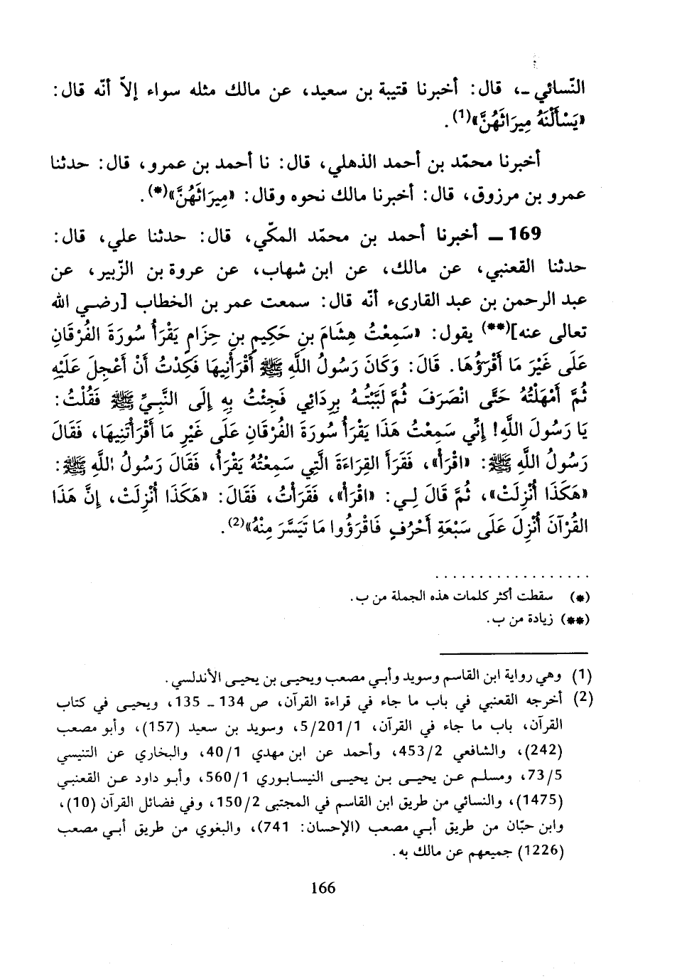 169 - أَخْبَرَنَا أَحْمَدُ بْنُ مُحَمَّدٍ الْمَكِّيُّ، قَالَ: حَدَّثَنَا عَلِيٌّ، قَالَ: حَدَّثَنَا الْقَعْنَبِيُّ، عَنْ مَالِكٍ، عَنِ ابْنِ شِهَابٍ، عَنْ عُرْوَةَ بْنِ الزُّبَيْرِ، عَنْ عَبْدِ الرَّحْمَنِ بْنِ عَبْدٍ الْقَارِئِ، أَنَّهُ قَالَ: سَمِعْتُ عُمَرَ بْنَ الْخَطَّابِ رَضِيَ اللَّهُ تَعَالَى عَنْهُ، يَقُولُ: " سَمِعْتُ هِشَامَ بْنَ حَكِيمِ بْنِ حِزَامٍ يَقْرَأُ سُورَةَ الْفُرْقَانِ عَلَى غَيْرِ مَا أَقْرَؤُهَا.