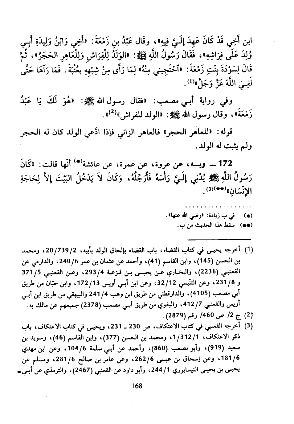 وَفِي رِوَايَةِ أَبِي مُصْعَبٍ: فَقَالَ رَسُولُ اللَّهِ صَلَّى اللَّهُ عَلَيْهِ وَسَلَّمَ: «هُوَ لَكَ يَا عَبْدُ بْنَ زَمْعَةَ».