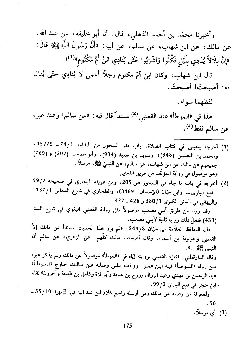 وَأَخْبَرَنَا مُحَمَّدُ بْنُ أَحْمَدَ الذُّهْلِيُّ، قَالَ: أنا أَبُو خَلِيفَةَ، عَنْ عَبْدِ اللَّهِ، عَنْ مَالِكٍ، عَنِ ابْنِ شِهَابٍ، عَنْ سَالِمٍ، عَنْ أَبِيهِ، أَنَّ رَسُولَ اللَّهِ صَلَّى اللَّهُ عَلَيْهِ وَسَلَّمَ، قَالَ: «إِنَّ بِلالا يُنَادِي بِلَيْلٍ فَكُلُوا وَاشْرَبُوا حَتَّى يُنَادِيَ ابْنُ أُمِّ مَكْتُومٍ».