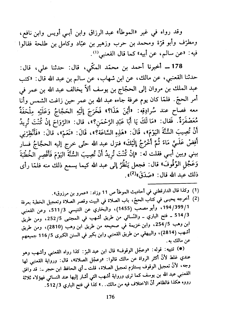 178 - أَخْبَرَنَا أَحْمَدُ بْنُ مُحَمَّدٍ الْمَكِّيُّ، قَالَ: حَدَّثَنَا عَلِيٌّ، قَالَ: حَدَّثَنَا الْقَعْنَبِيُّ، عَنْ مَالِكٍ، عَنِ ابْنِ شِهَابٍ، عَنْ سَالِمِ بْنِ عَبْدِ اللَّهِ، قَالَ: كَتَبَ عَبْدُ الْمَلِكِ بْنُ مَرْوَانَ إِلَى الْحَجَّاجِ بْنِ يُوسُفَ: أَلا يُخَالِفَ عَبْدَ اللَّهِ بْنَ عُمَرَ فِي أَمْرِ الْحَجِّ.